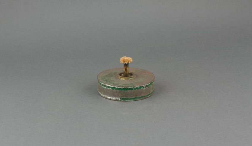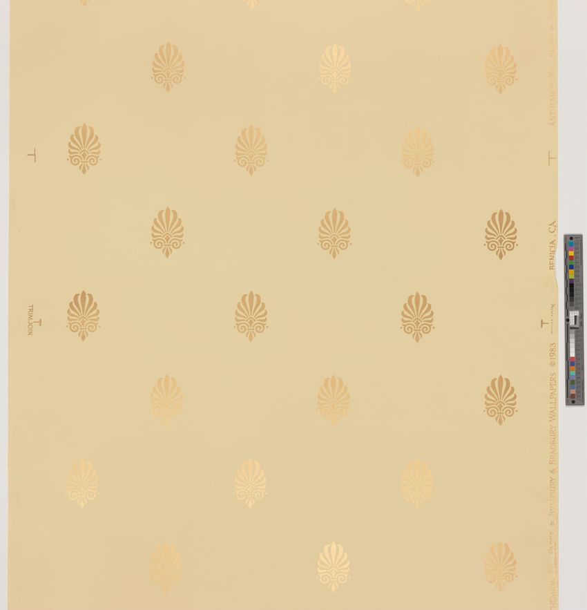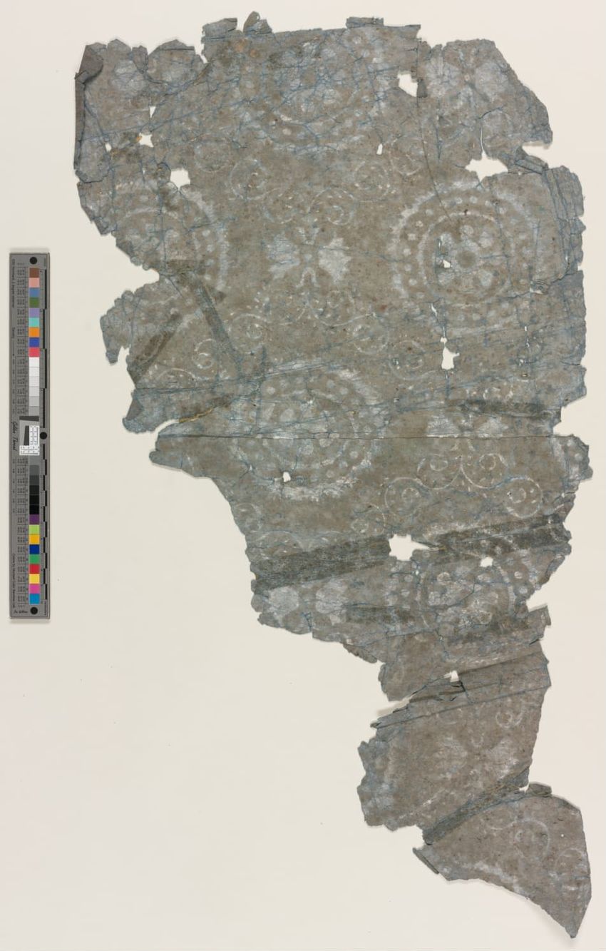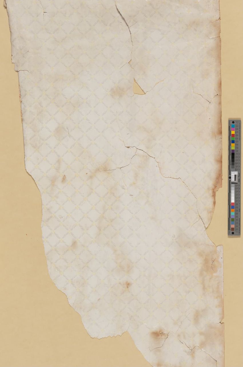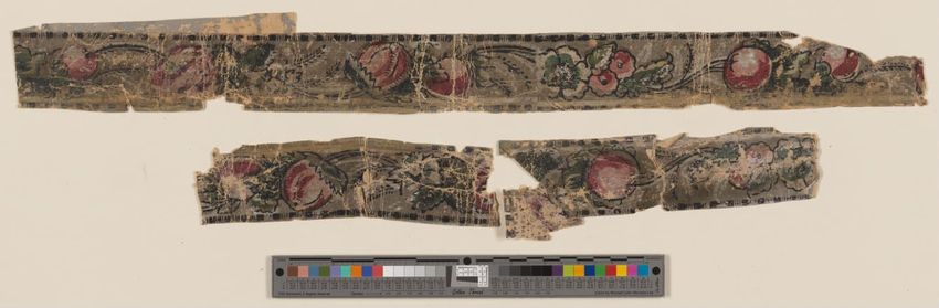 Wallpaper border fragment from Falmouth, Massachusetts. Oakleaf and daisy border. Block-printed in red, three greens, two olive greens, two purples, mauve, two grays, four browns, dark blue, tan and ochre.