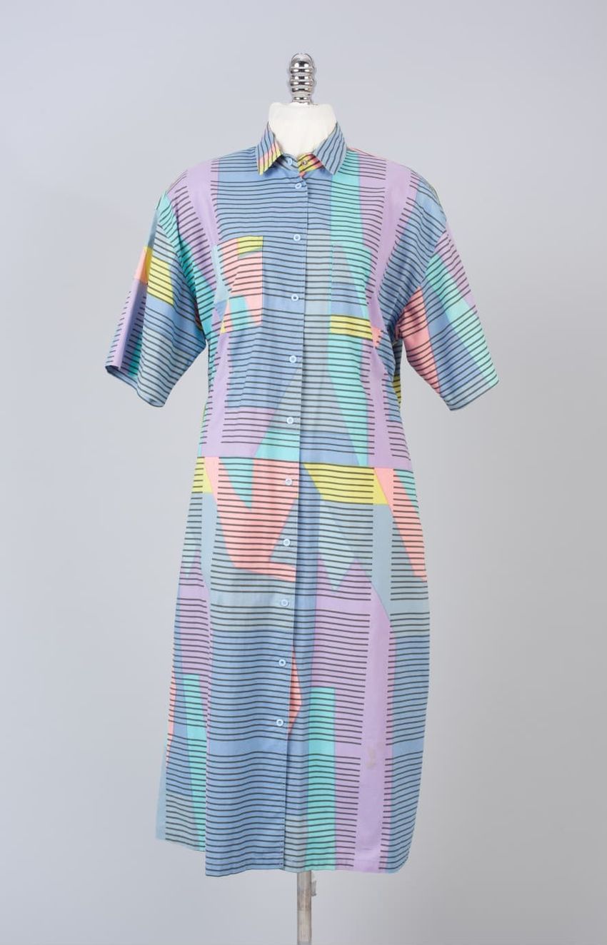 Shirt, collar, long sleeves, single button cuffs, seven button front closure, and single breast pocket. Vertical stripes in lime green, burgundy, and magenta. Size: 14.