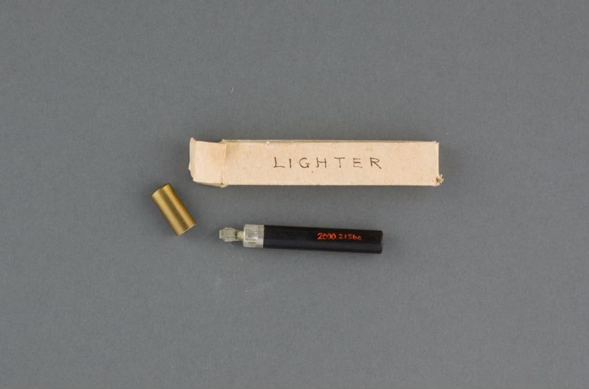 Black resin pocket lighter with brass cover. Instruction manual inside cardboard box.