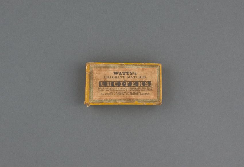 Yellow cardboard matchbox "Watt's Chlorate Matches or Lucifers."