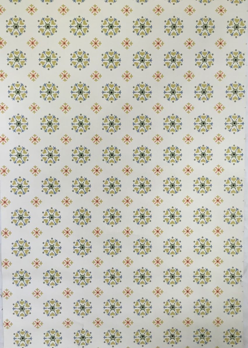 Roll of wallpaper [2011.20.5.1] and separate fragment [2011.20.5.2] with pattern of larger yellow and blue medallions and smaller orange and yellow medallions.