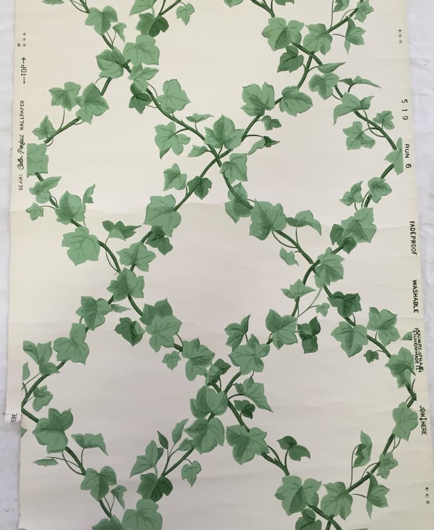 Roll of wallpaper [2011.20.11.1] and fragment [2011.20.11.2] with green ivory leaf latice pattern on white background.