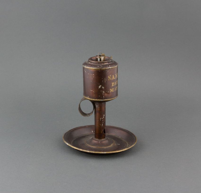 Tin japanned lard chamber lamp with gold bands and stenciling.