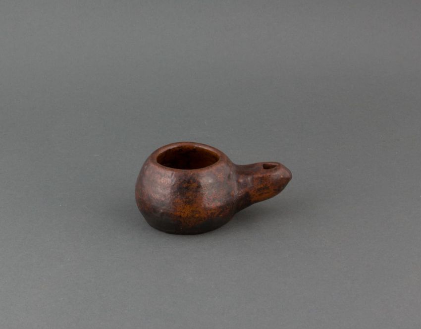 Stoneware grease lamp with enclosed nozzle and reddish-brown glaze.