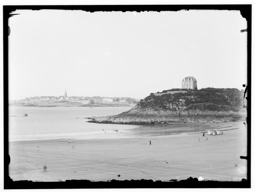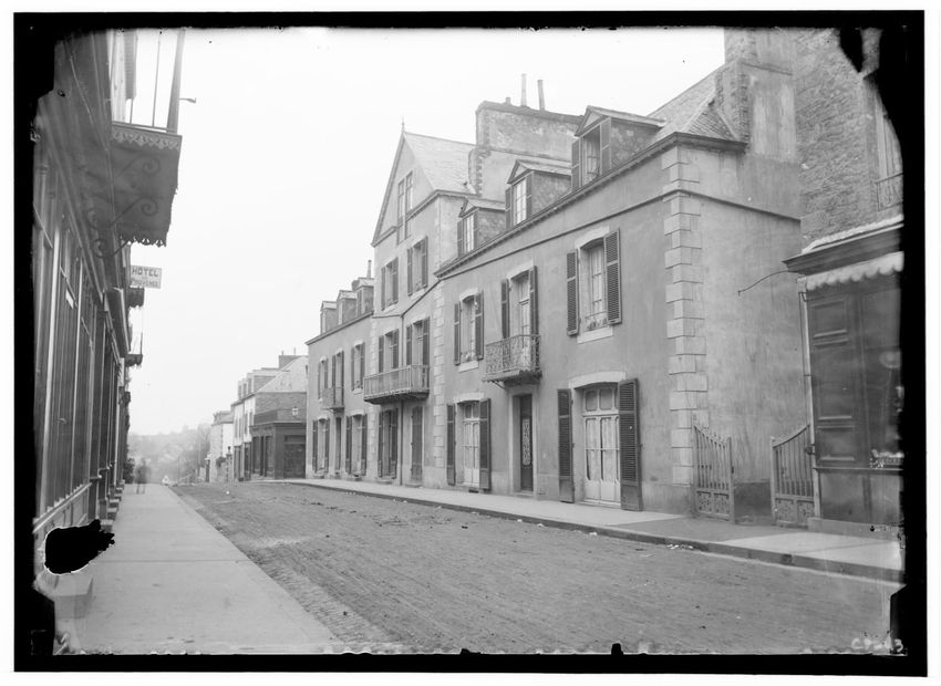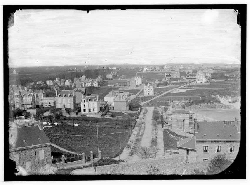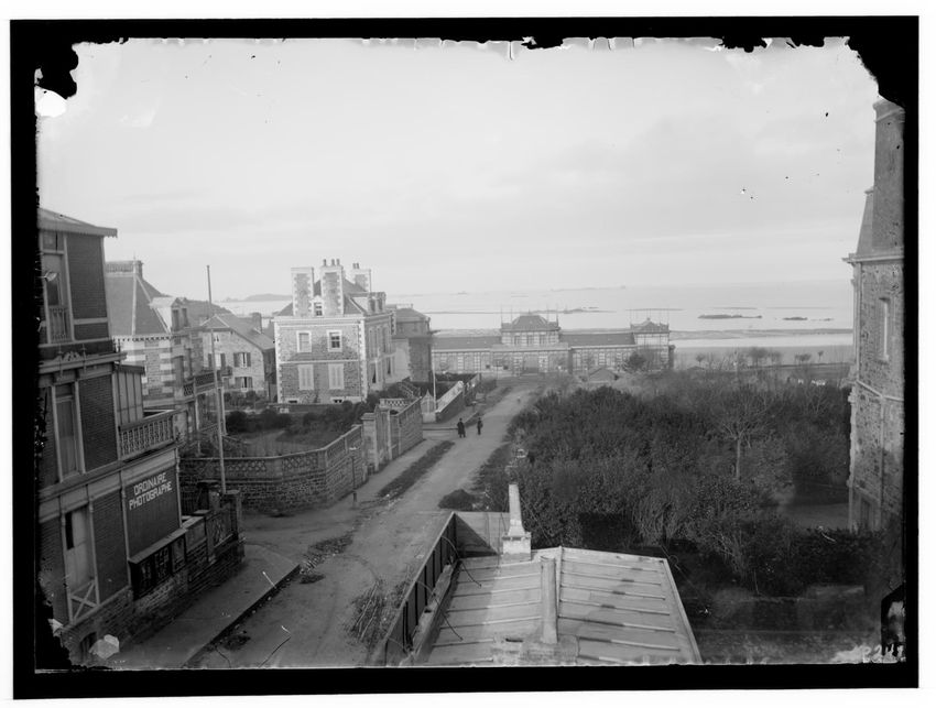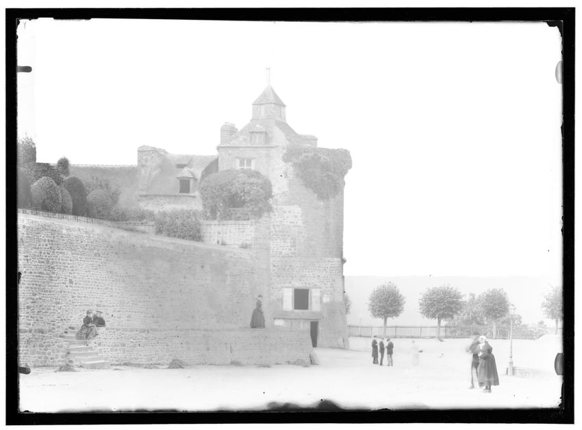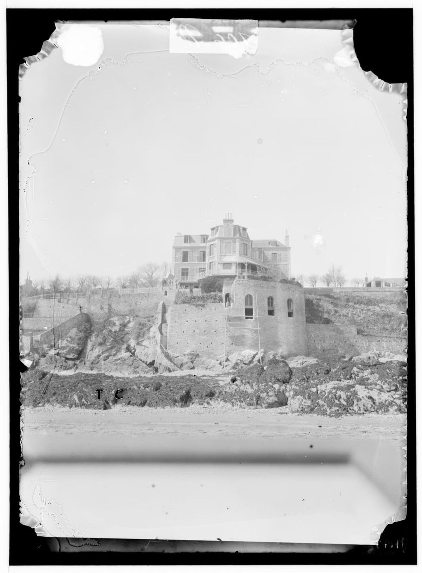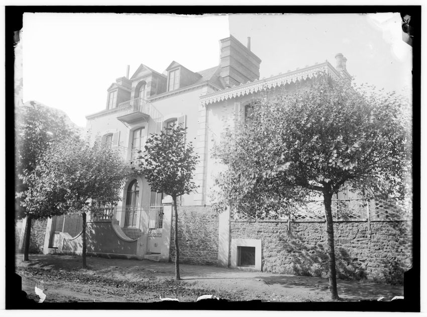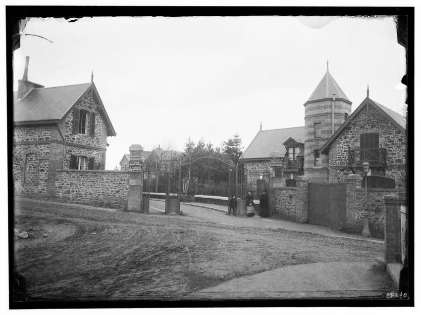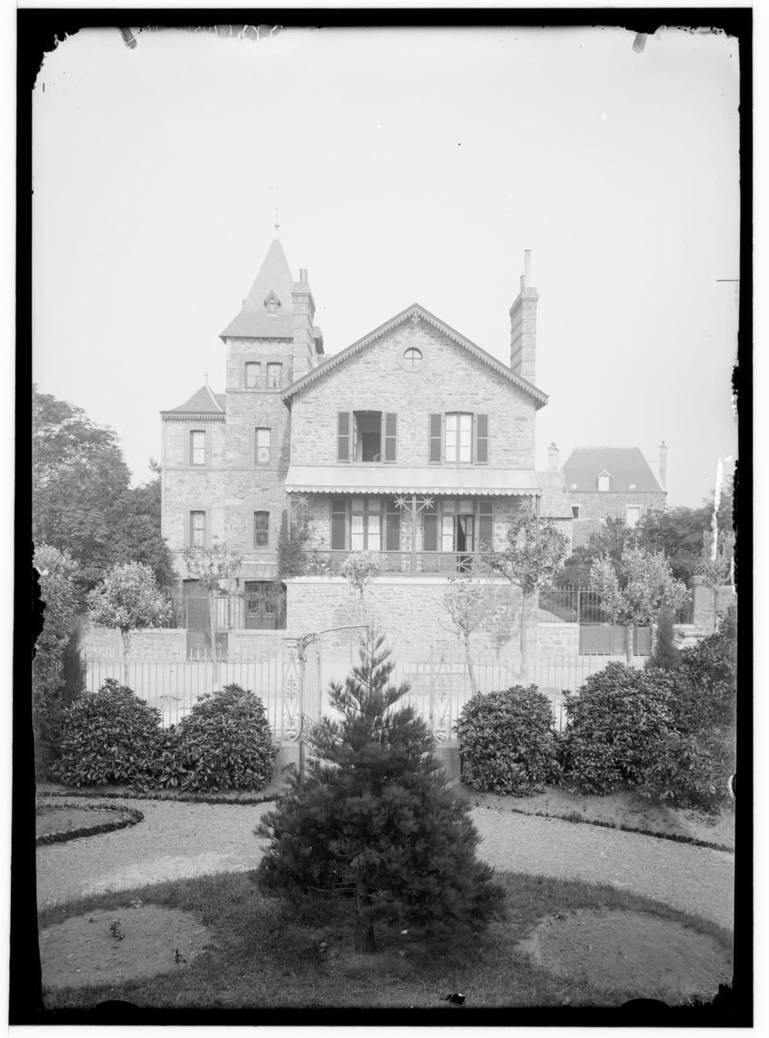 The image shows a large, multi-story stone house in Dinard, France, featuring a tall, pointed tower on the left side and several chimneys. There is a well-maintained back garden with a winding path, shrubs along a fence, and a small tree in the foreground. The house is enclosed by a decorative metal...