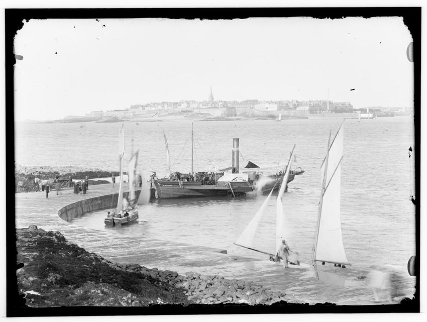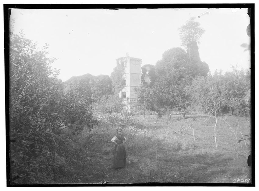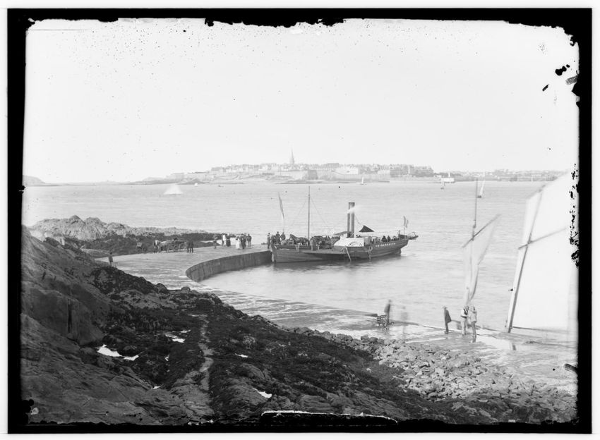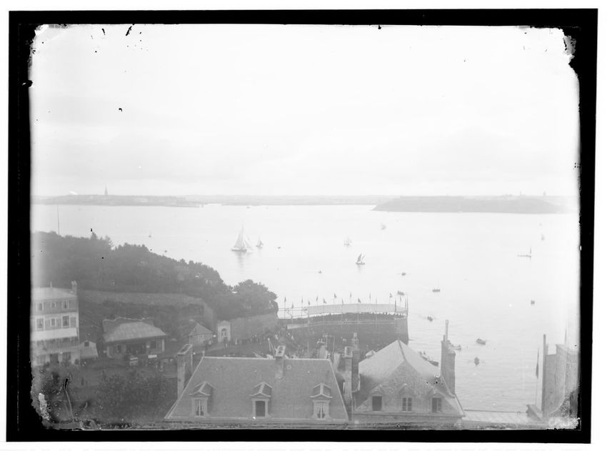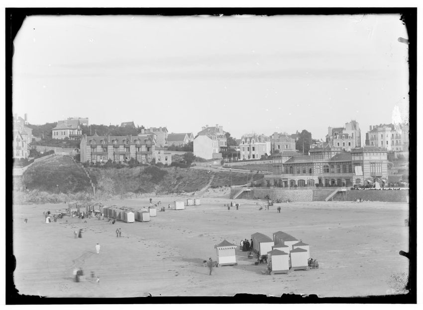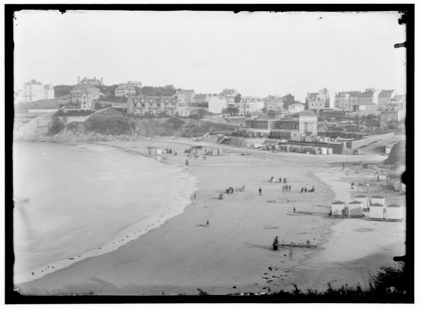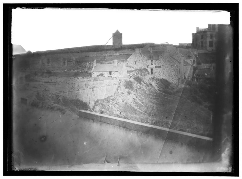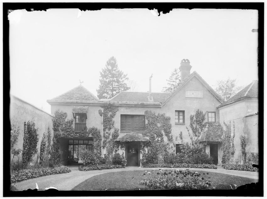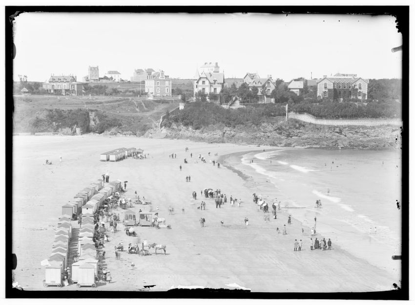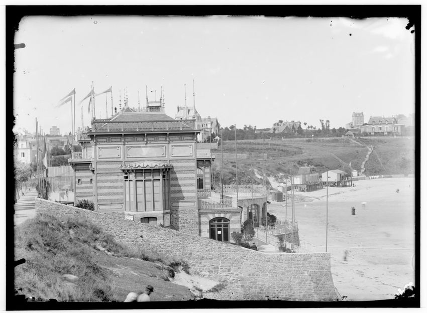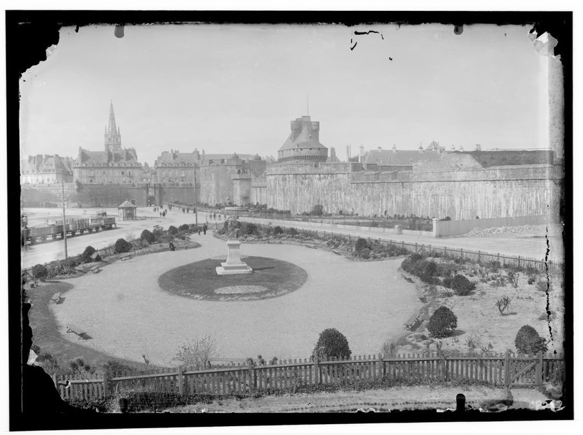 The image shows a large, multi-story stone house in Dinard, France, featuring a tall, pointed tower on the left side and several chimneys. There is a well-maintained back garden with a winding path, shrubs along a fence, and a small tree in the foreground. The house is enclosed by a decorative metal...