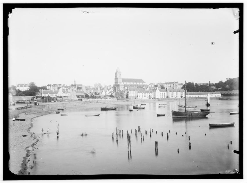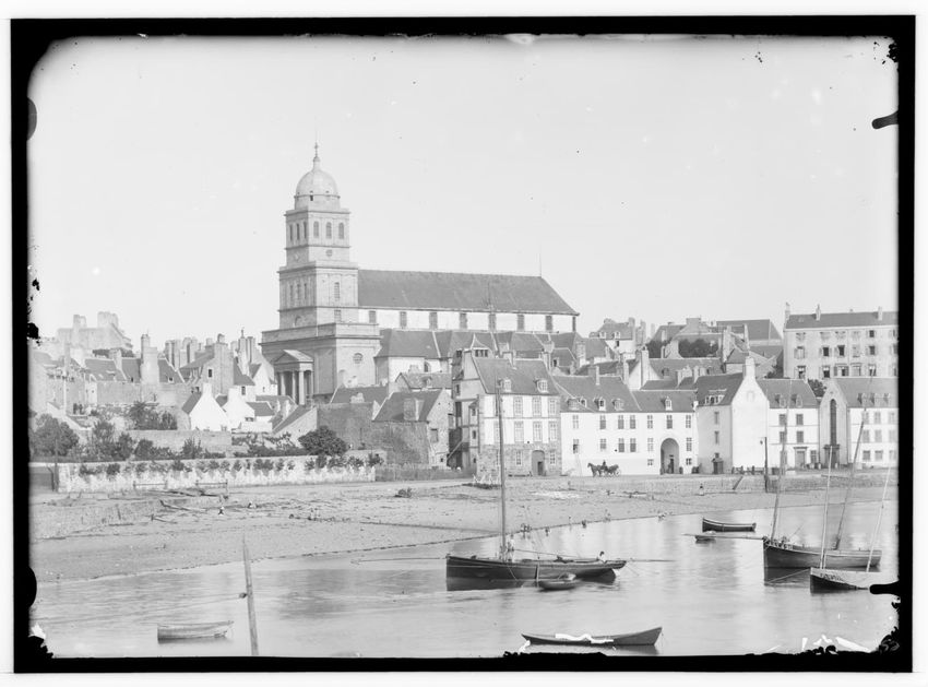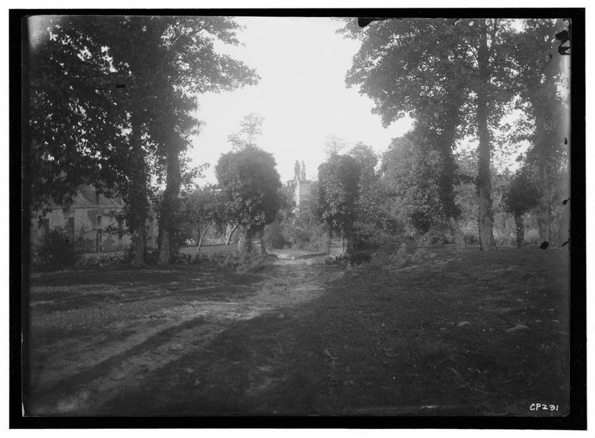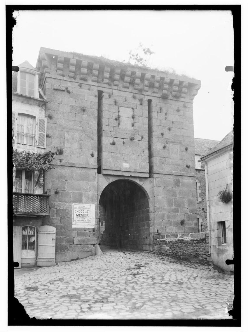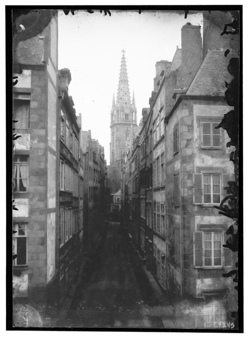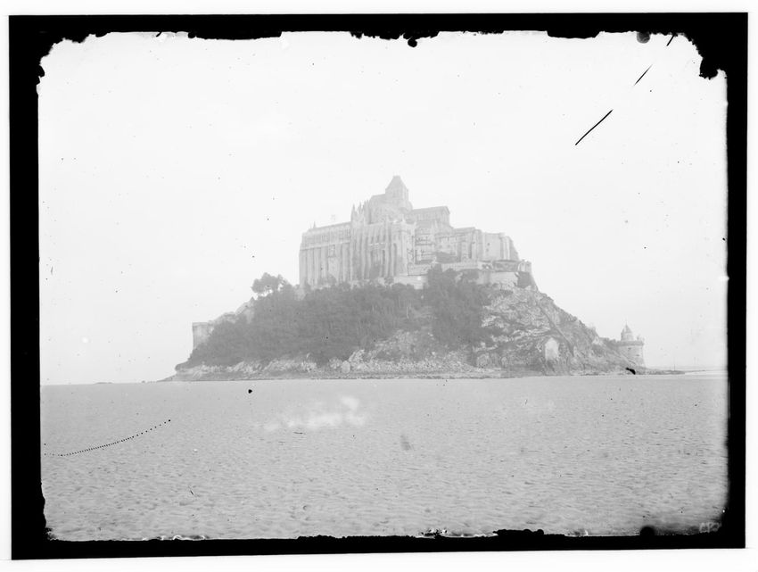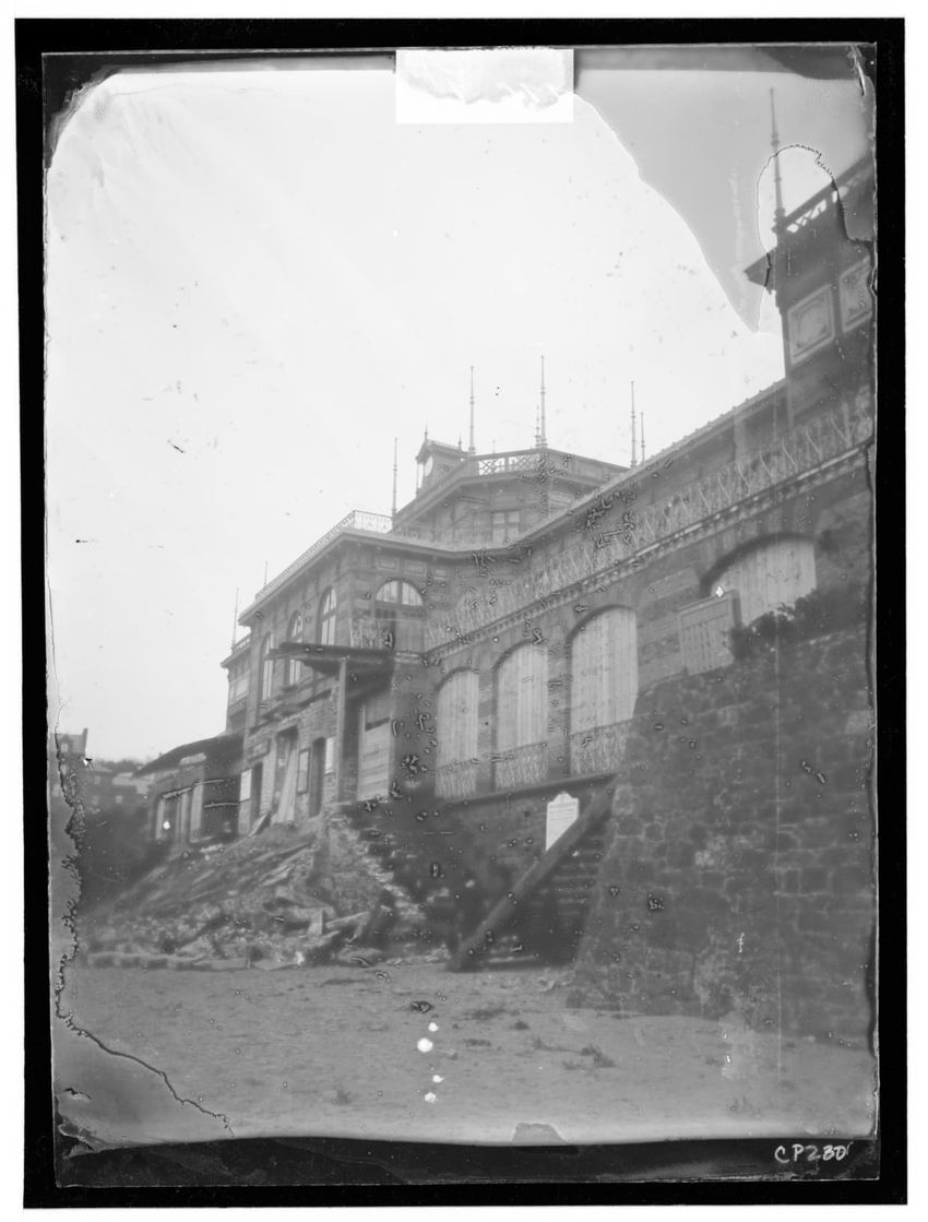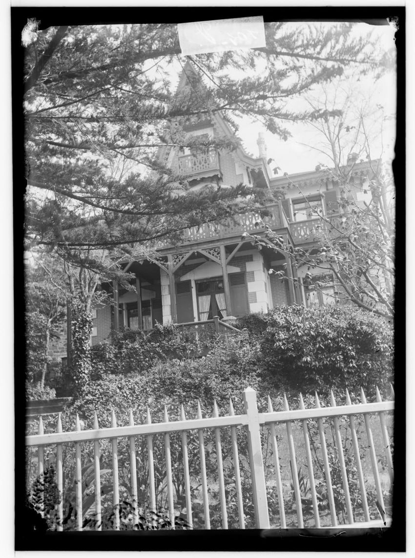 The image shows a large, multi-story stone house in Dinard, France, featuring a tall, pointed tower on the left side and several chimneys. There is a well-maintained back garden with a winding path, shrubs along a fence, and a small tree in the foreground. The house is enclosed by a decorative metal...