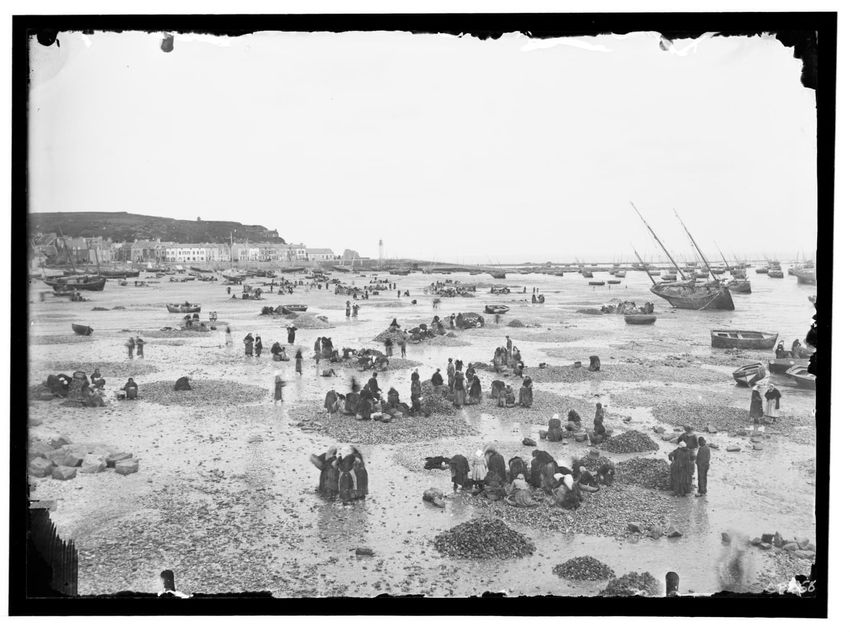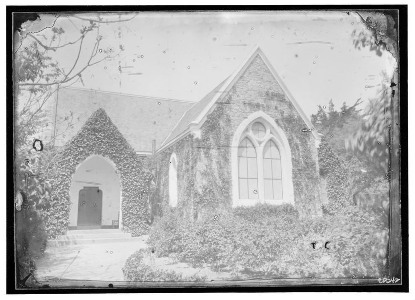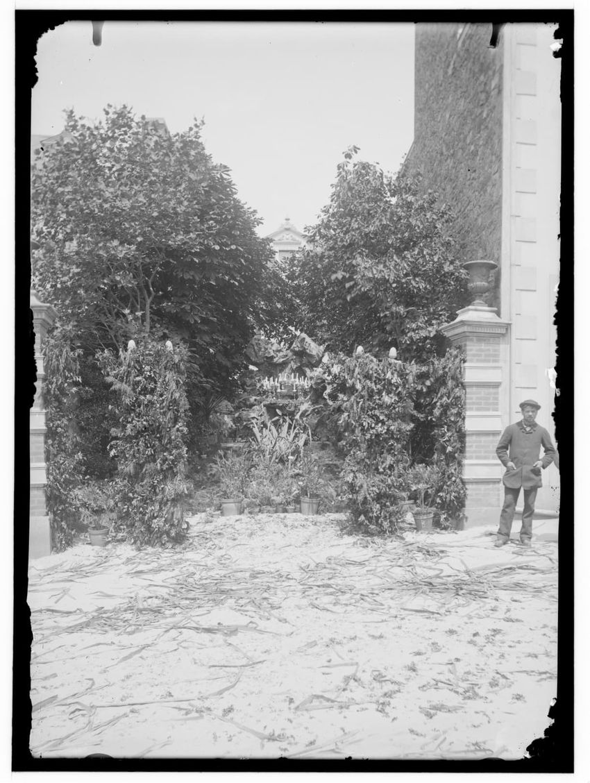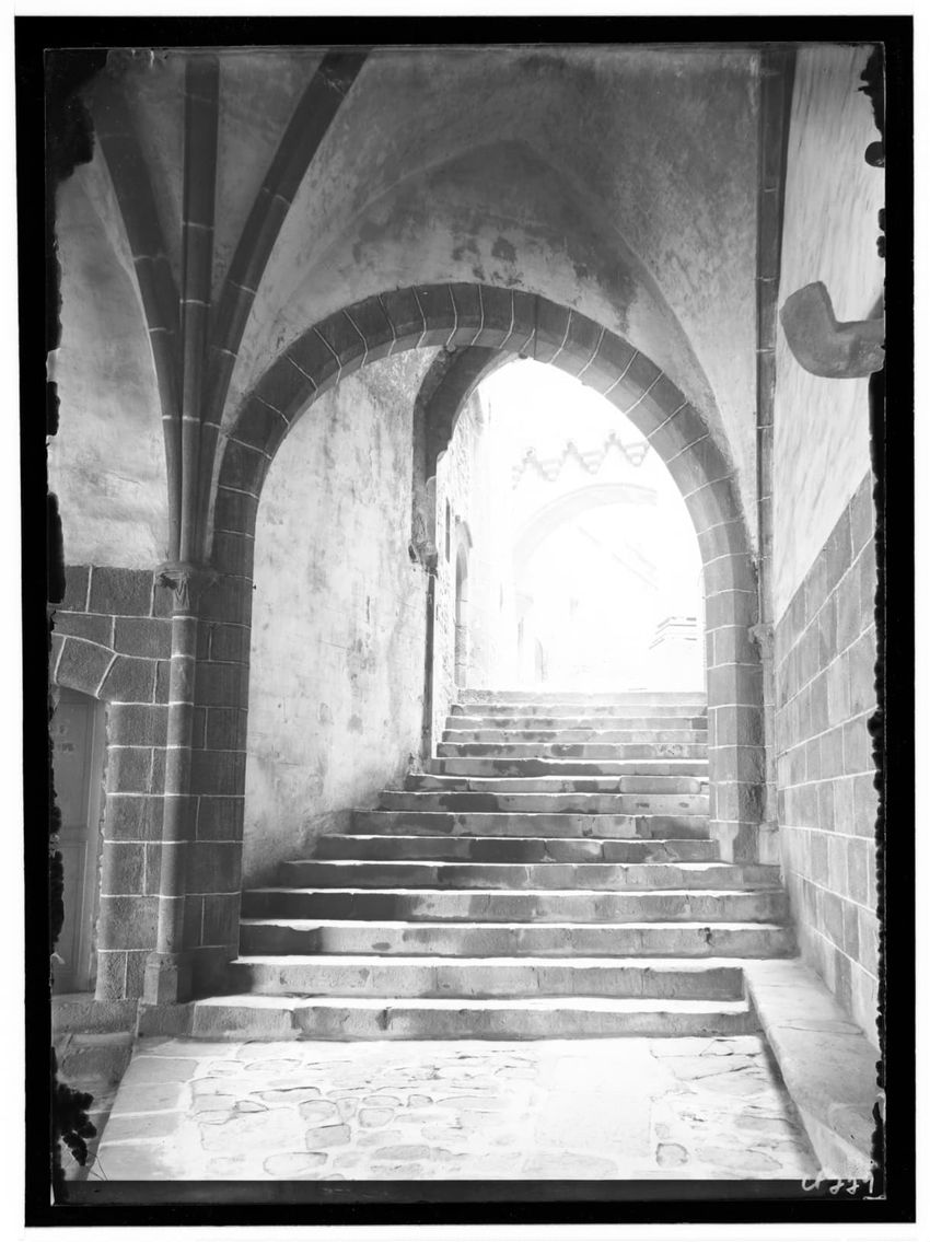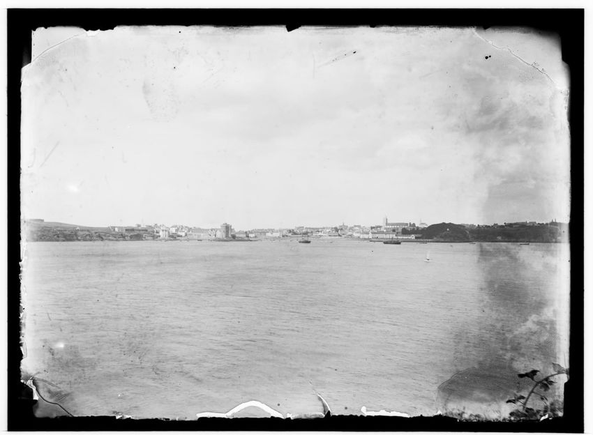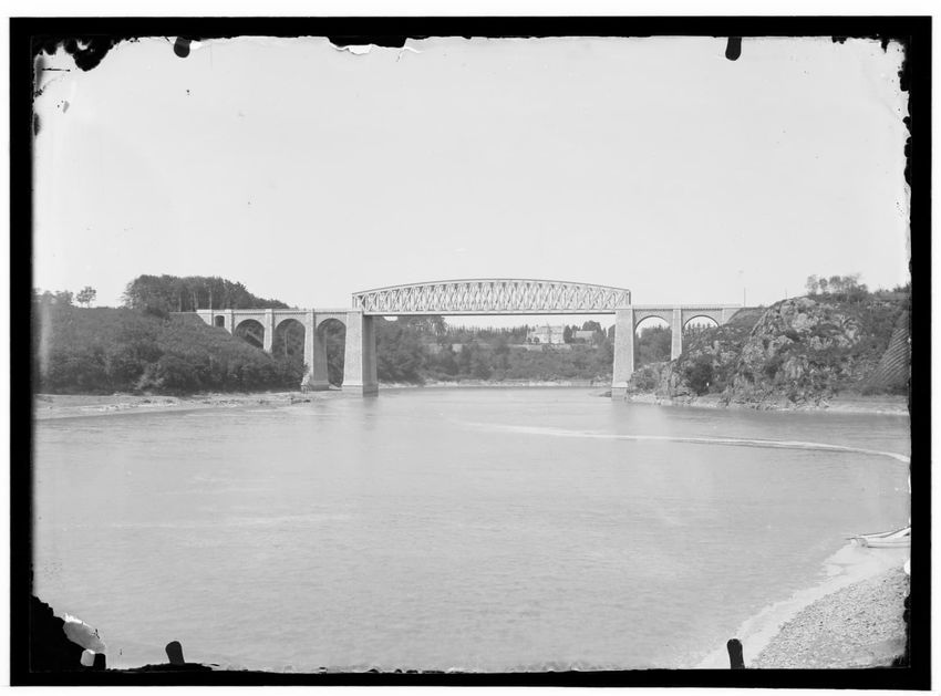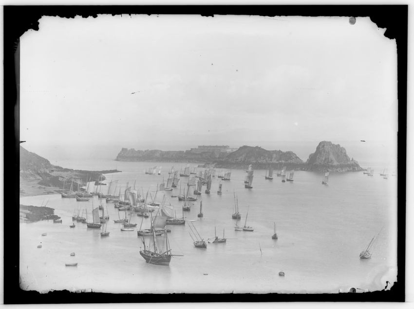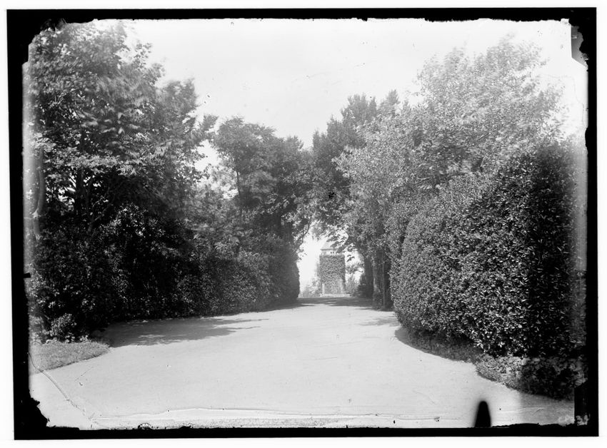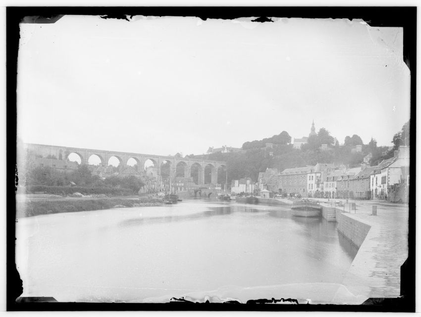 The image shows a large, multi-story stone house in Dinard, France, featuring a tall, pointed tower on the left side and several chimneys. There is a well-maintained back garden with a winding path, shrubs along a fence, and a small tree in the foreground. The house is enclosed by a decorative metal...