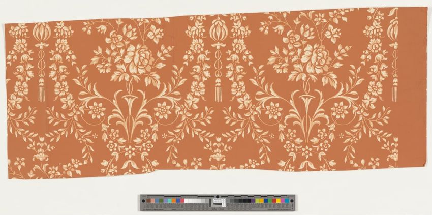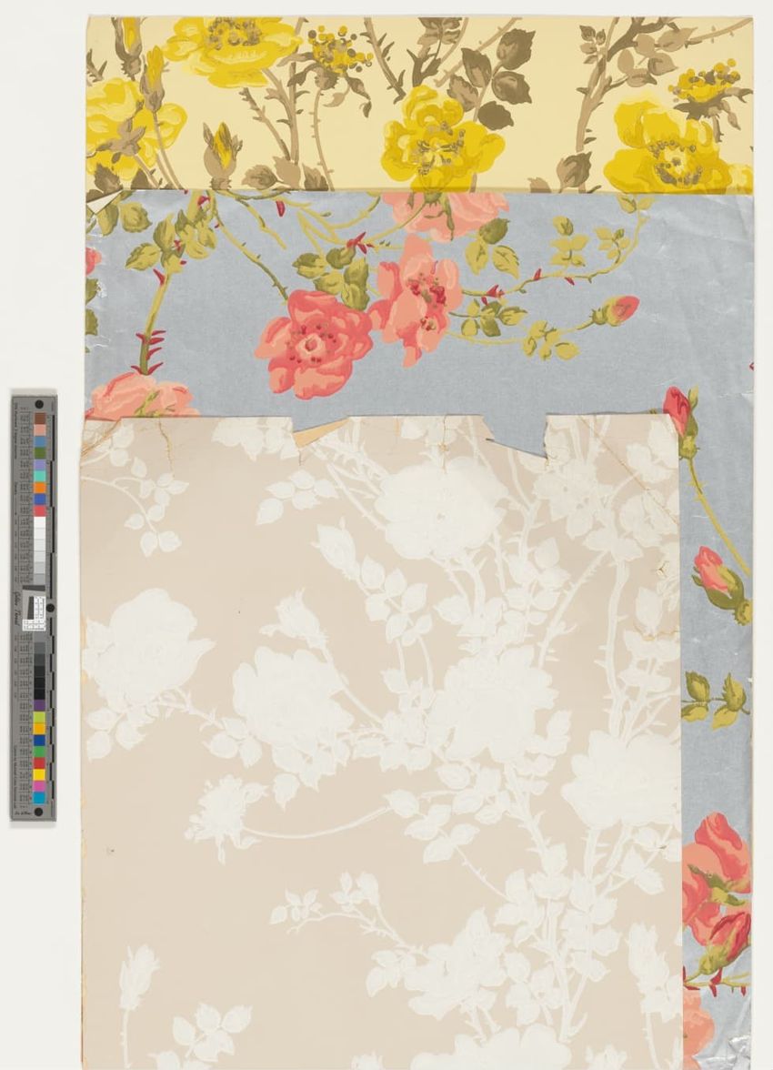 Fragment of floral wallpaper border with trimmed edge. Naturalistic pink flowers and buds on green leafy branches or grasses. Flocked red background is overprinted with black to emulate shadow. Block-printed in two greens, two browns, yellow, two pinks, mauve, red, black and red flocking on olive g...
