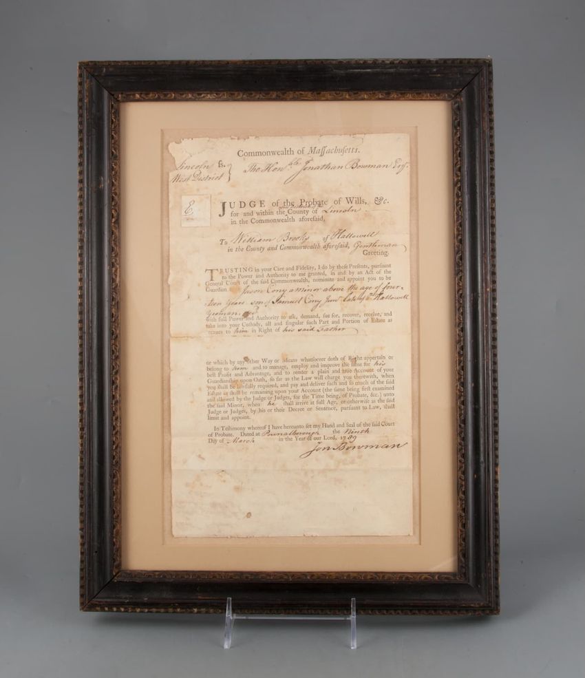 An 1811 document in ink on paper, signed Grainger, from the General Post Office, Wiscasset provenance, regarding the dismissal of Mr. Bowman (later Bowman), contained in a black wooden frame with a gilded interior border with relief decoration.