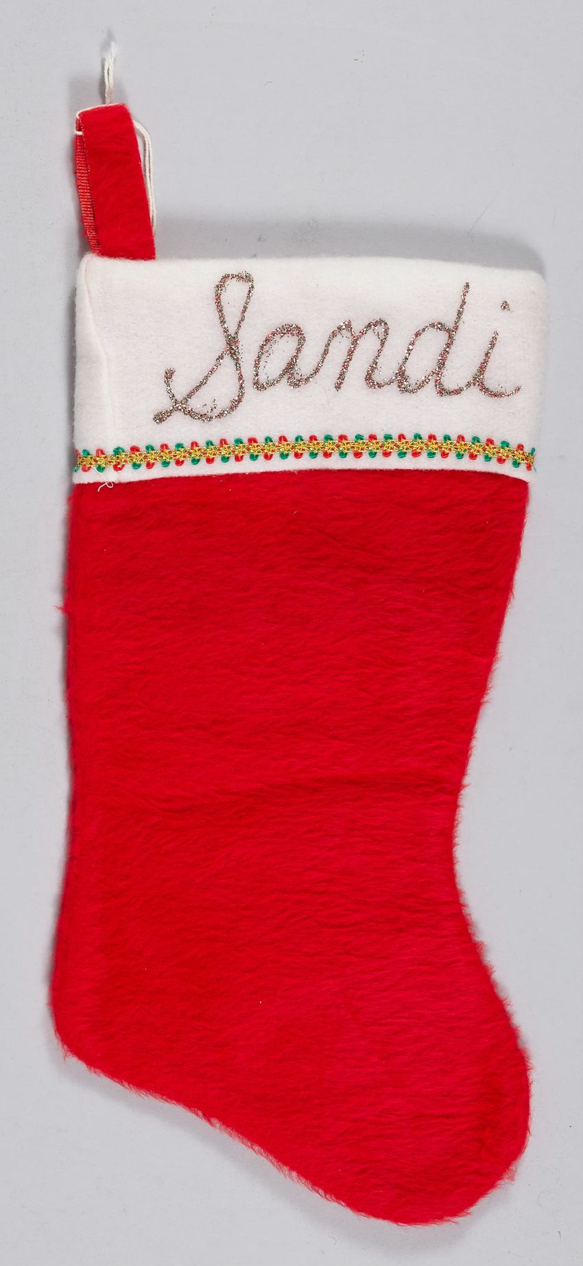 Christmas stocking with name "Sandi" in red, green, and white glitter on trim. Red synthetic fur. Green, red, and gold stitching below white felt trim. Red loop to hang stocking.