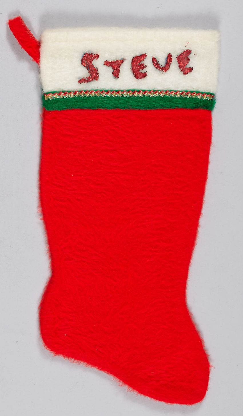 Christmas stocking with name "Steve" in red glitter on trim. Red synthetic fur. Green strip with green, red, and gold stitching below white trim. Red loop to hang stocking.