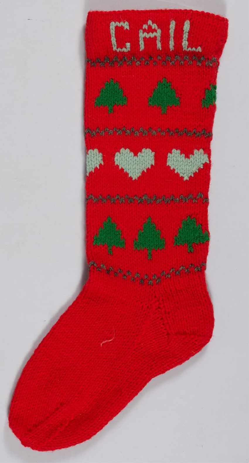 Knit Christmas stocking with the name "Gail" and tree and heart design.