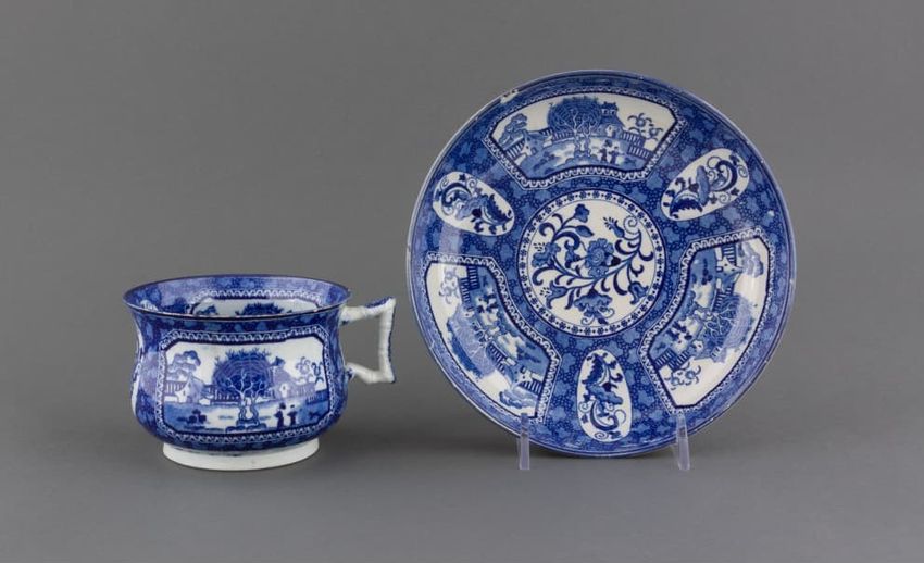 Earthenware urn-shaped vase with chocolate brown matte glaze and rounded foot. Applied strap handles that terminate in foliate design. Relief image of a woman in the center of a medallion with egg and dart molded decoration surrounded by scrolls, leaves, birds. On the opposite side, scrolling foli...