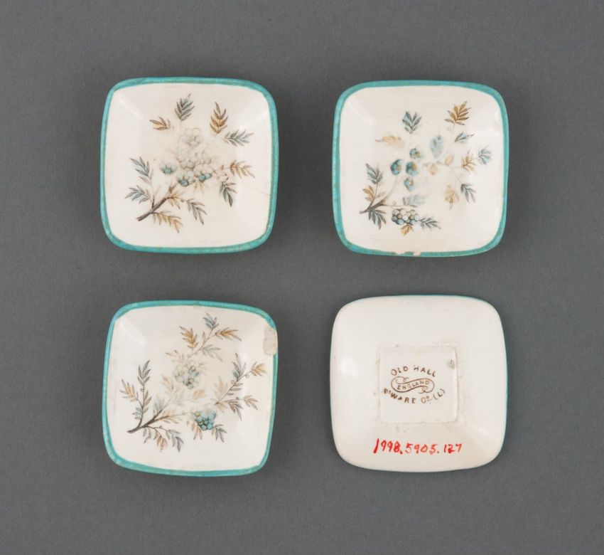 Four small, square individual butter dishes. Part of a "Hampden" pattern dinner service for twelve. Designed by Christopher Dresser and produced by the Old Hall Earthenware Company, England. Light cream-colored body with aqua trim, decorated with a transfer-printed and overpainted floral branch in b...