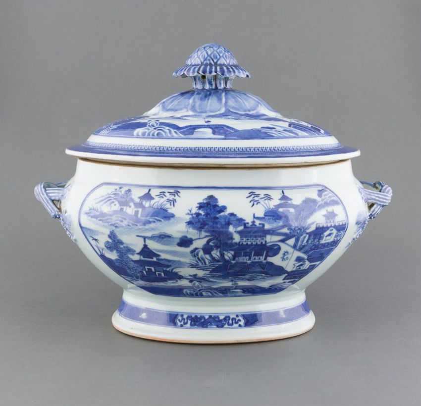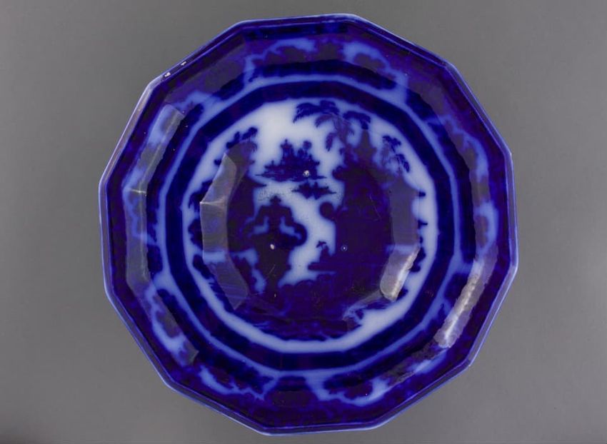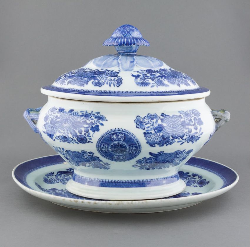 Porcelain teapot stand. Shallow oval form with canted sides. Central medallion with cobalt blue, orange and gilt design of leaves, tendrils, abstract motifs, and stylized flowers on white background in three reserves separated by gilt leaf sprays and pendant flowers on cobalt blue background in a br...