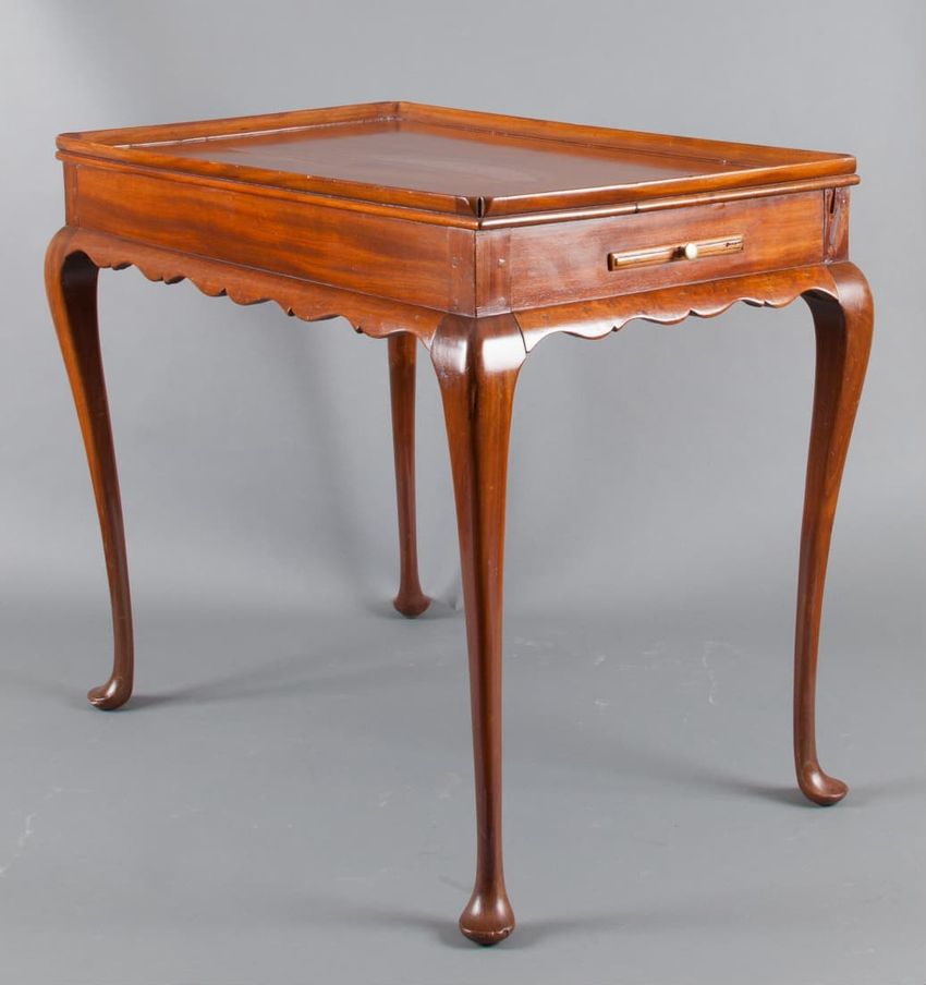 Mahogany pole screen with an urn finial, an urn and ring turned shaft, a tripod base with snake feet, and a petit-point panel. Large rectangular needlework screen with central female figure, flanked by three men and a boy with horses, distant castle, framed by Rococo floral motif.