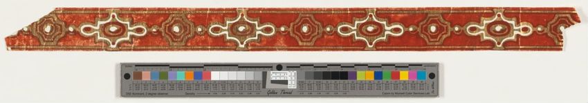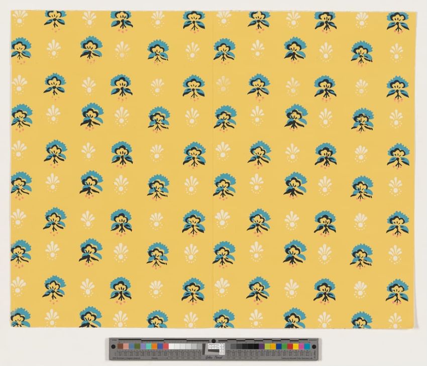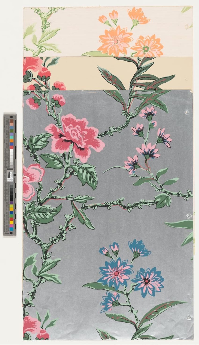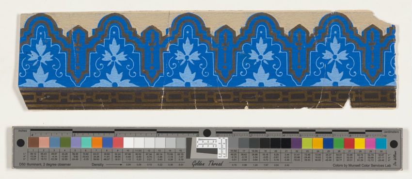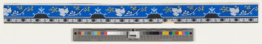 Long fragment of strawberry wallpaper border. Strawberry plants with pink berries, white flowers and green leaves on an upper band of white and lower band of blue. Thin blue stripe along upper edge. Roller-printed in blue, three greens, two pinks, red, brown, ochre and yellow on white ground.