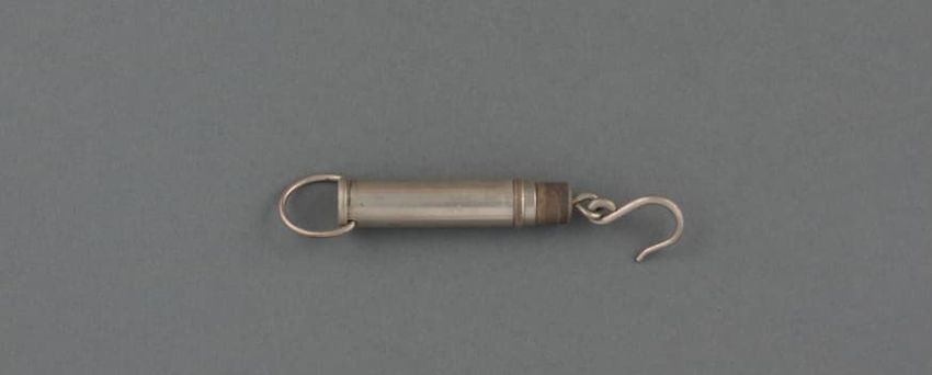 Metal fish scale with a hook and a telescoped shaft.