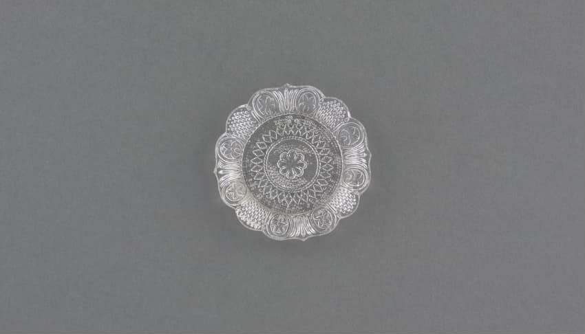Pressed glass cup plate. Geometric scroll and foliate pattern.