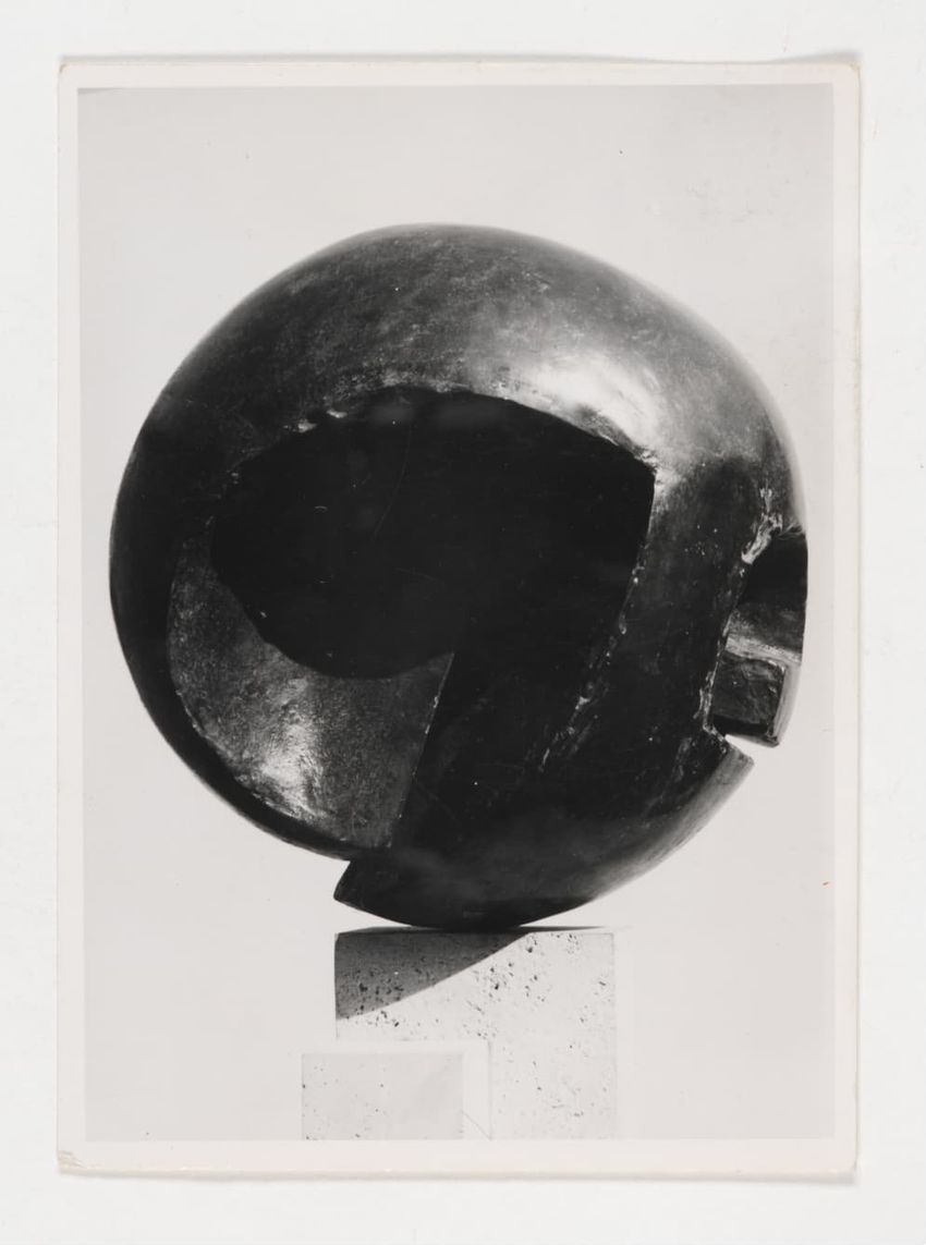 Postcard with black-and-white image of a sculpture on the front. Printed text in upper left corner on the back identifies sculpture as "Eclipse 1" by James Wines. Italian postage.