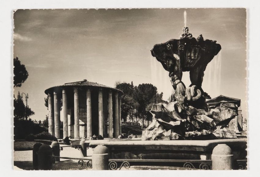 Postcard with a photograph of the Temple of Vesta and fountain. Printed and handwritten inscriptions on back.