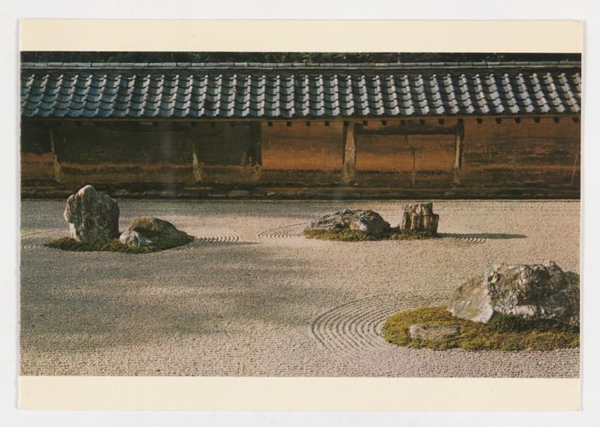 Greeting card with image of a Japanese rock garden on the front cover and embossed scrollwork borders. A second layer of paper in the interior bears printed and stamped inscriptions.
