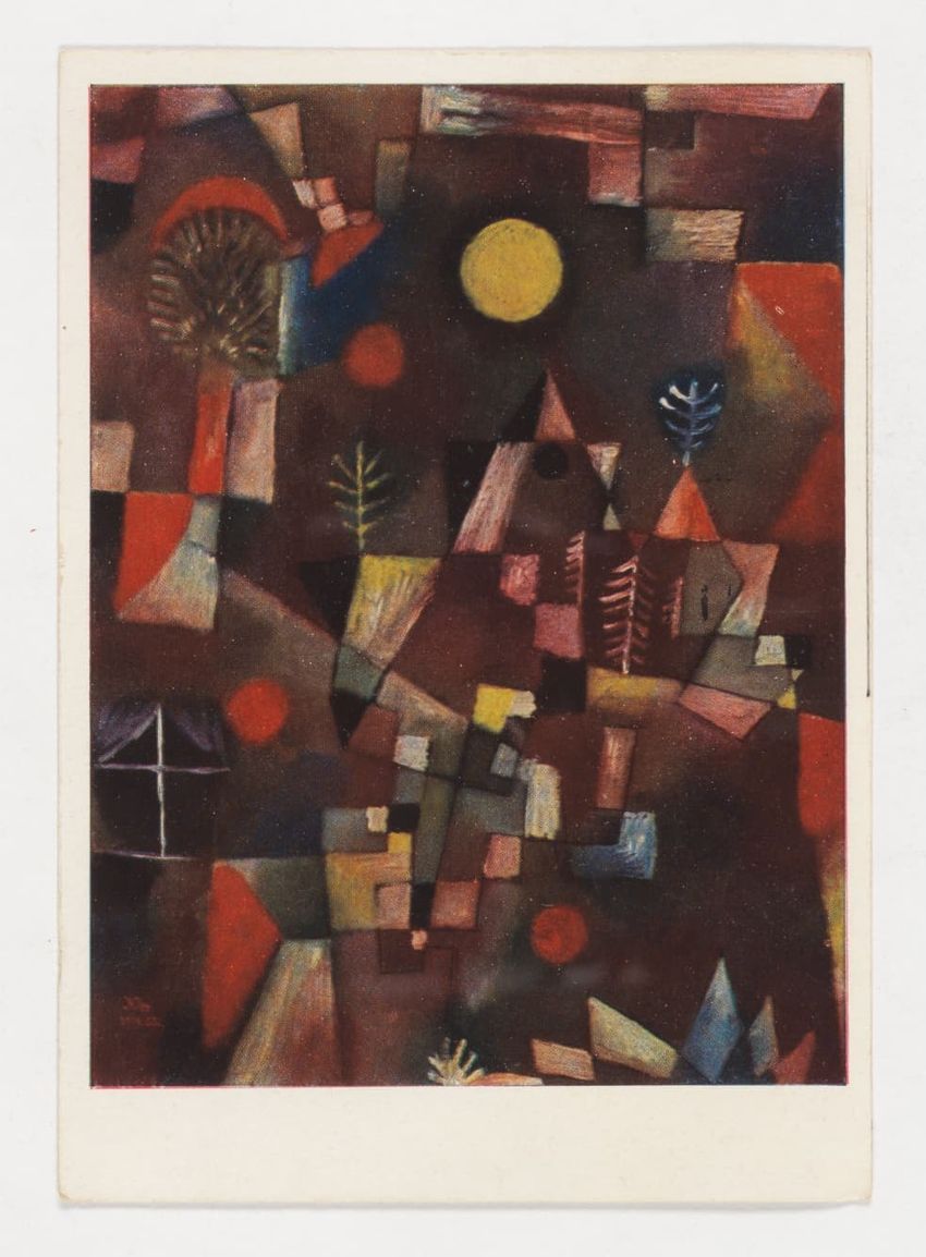 Postcard with a work by Paul Klee printed on the front. Printed and handwritten inscriptions on back. United States postage, Grand Central Station.