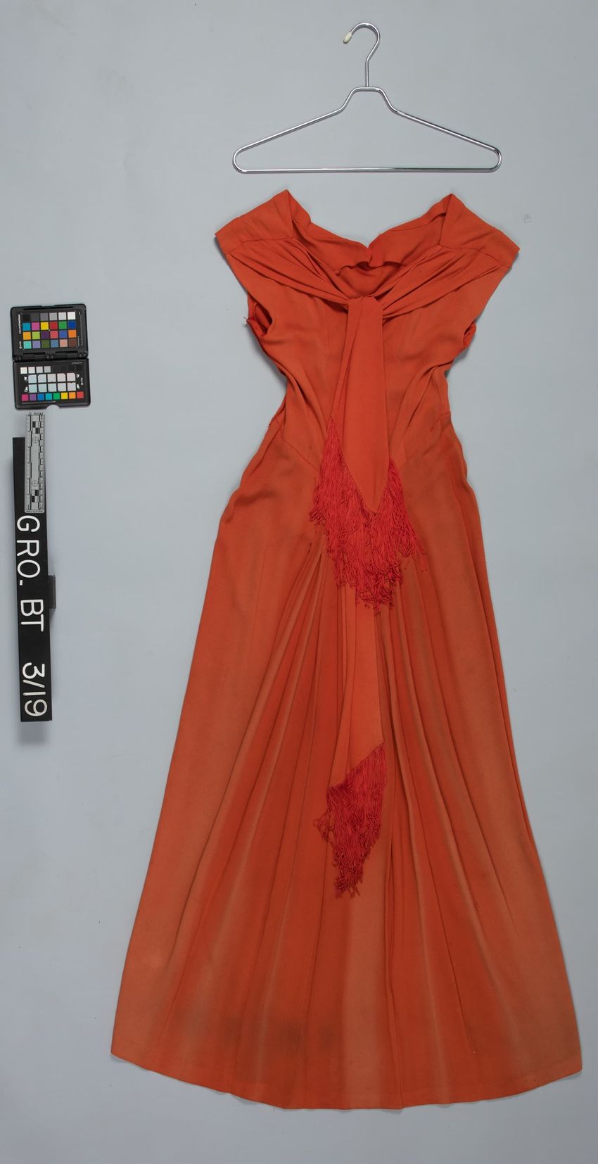 Women's sleeveless dress with long fringed ties at the neck.
