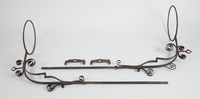 (B,D) Pair of wrought iron brackets with ornamental scrolls and large round elements on the ends. Possibly cressets, although the fire would be close to the wood siding of the house. (A,C) Pair of torchieres original to the Hancock house, situated on the left and right sides of the front door.