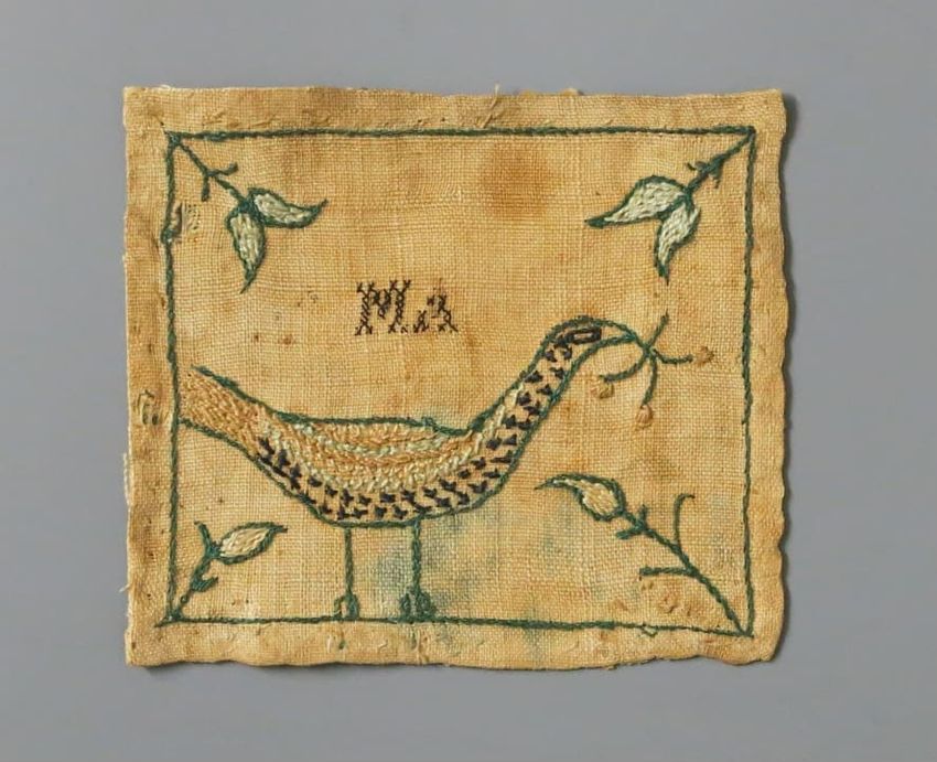 Upholstered wing chair with serpentine back, S-curved arms, cabriole legs, and claw-and-ball feet. Rear legs rectangular. Brown wool covering couched couched with black. In center of back is square needlepoint with flowers, fish, butterfly, bicycle, bee, horn and key on black background.