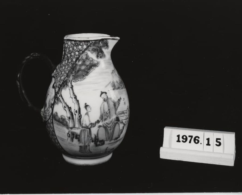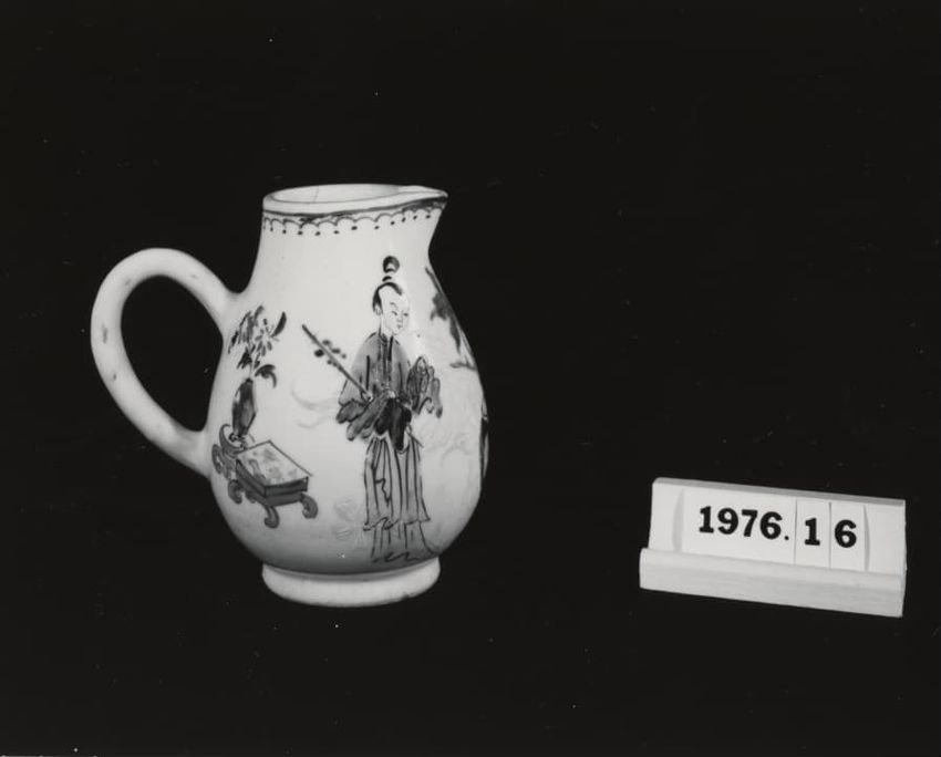 Bulbous-shaped body swelling at bottom and terminating in small circular mouth with pointed triangular spout. Circular foot ring. Applied C-scroll handle. Polychrome enameled over glaze domestic design of seated aristocratic man being served by two females. Design superimposed on bianco-sur-bianco f...