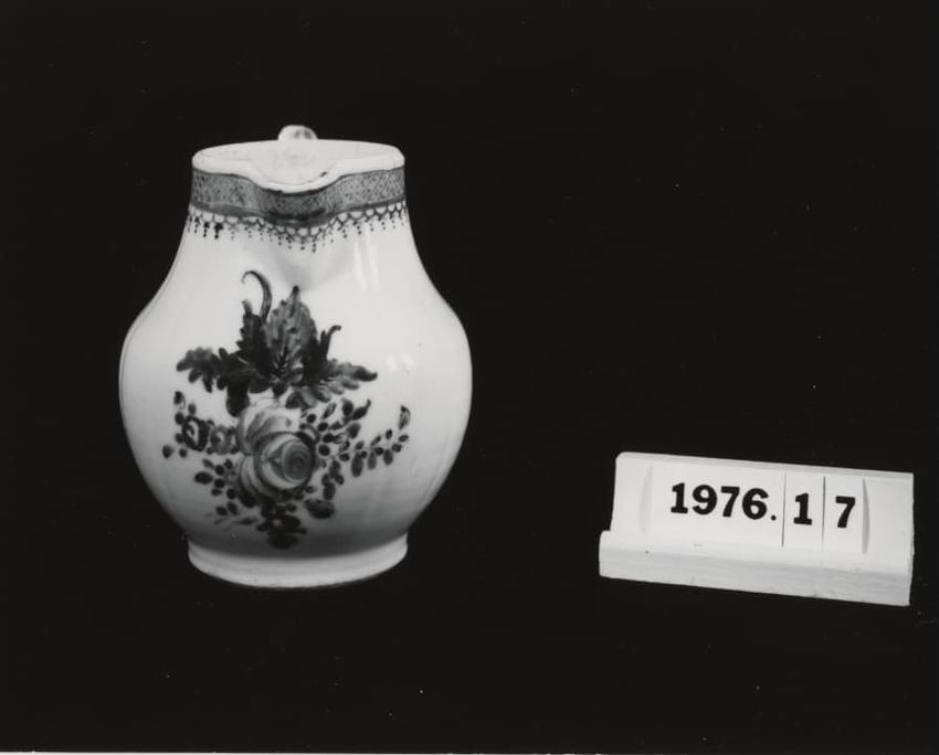 Bulbous body with molded ribbed design terminating in a circular mouth with spout. Molded C-scroll handle. White glazed body with polychrome over glaze central floral design (violet, red, blue, green). Diapered violet band around rim with secondary scallop and spearhead borders.