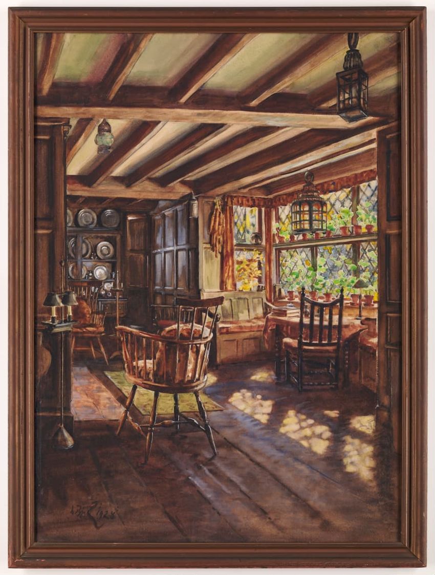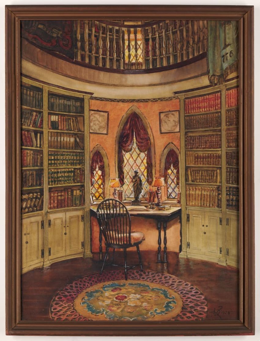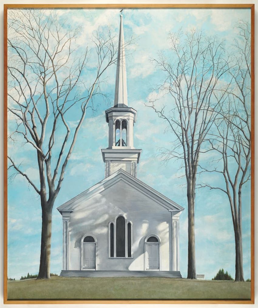 Needlepoint picture depicting an eighteenth-century farmhouse and farm in Belchertown, Massachusetts surrounded by several individuals taking part in various leisure activities, including golf, tennis, swimming, and gardening. Farm animals, wild animals, and domestic pets are also featured, includin...