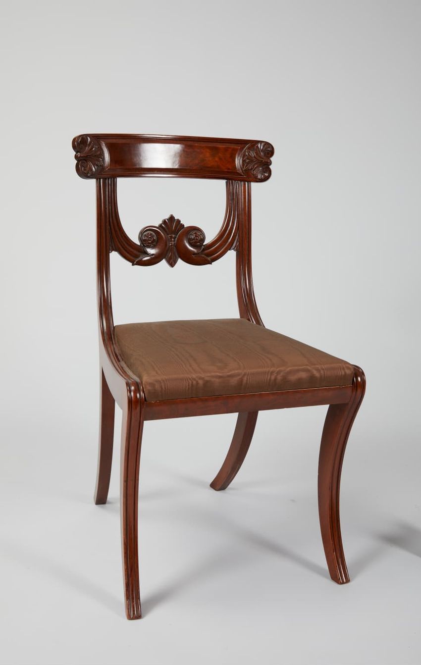 Mahogany and birch side chair, 1824-1825, by Isaac Vose and Son, THomas Wightman carver in Boston. The chair is made in the Classical style.