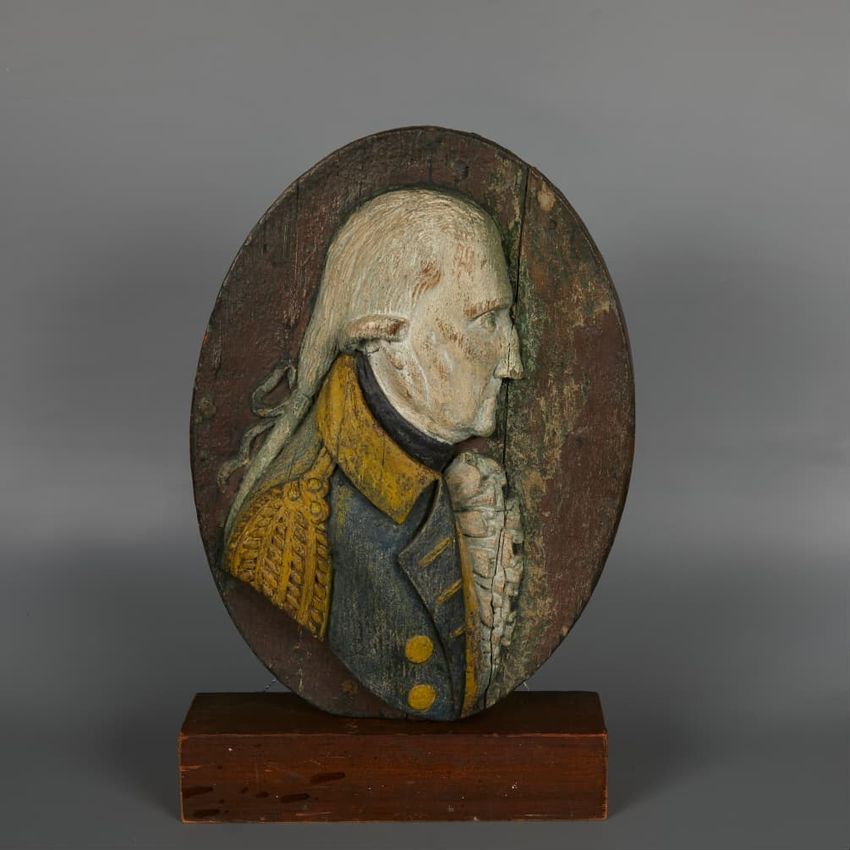 Two-sided carved and painted George Washington profile portrait medallion, carved by Samuel McIntire. Composed of two medallions fastened back-to-back, the figures carved in high relief with George Washington facing to the right in a blue-painted military uniform with yellow-painted facings and epau...