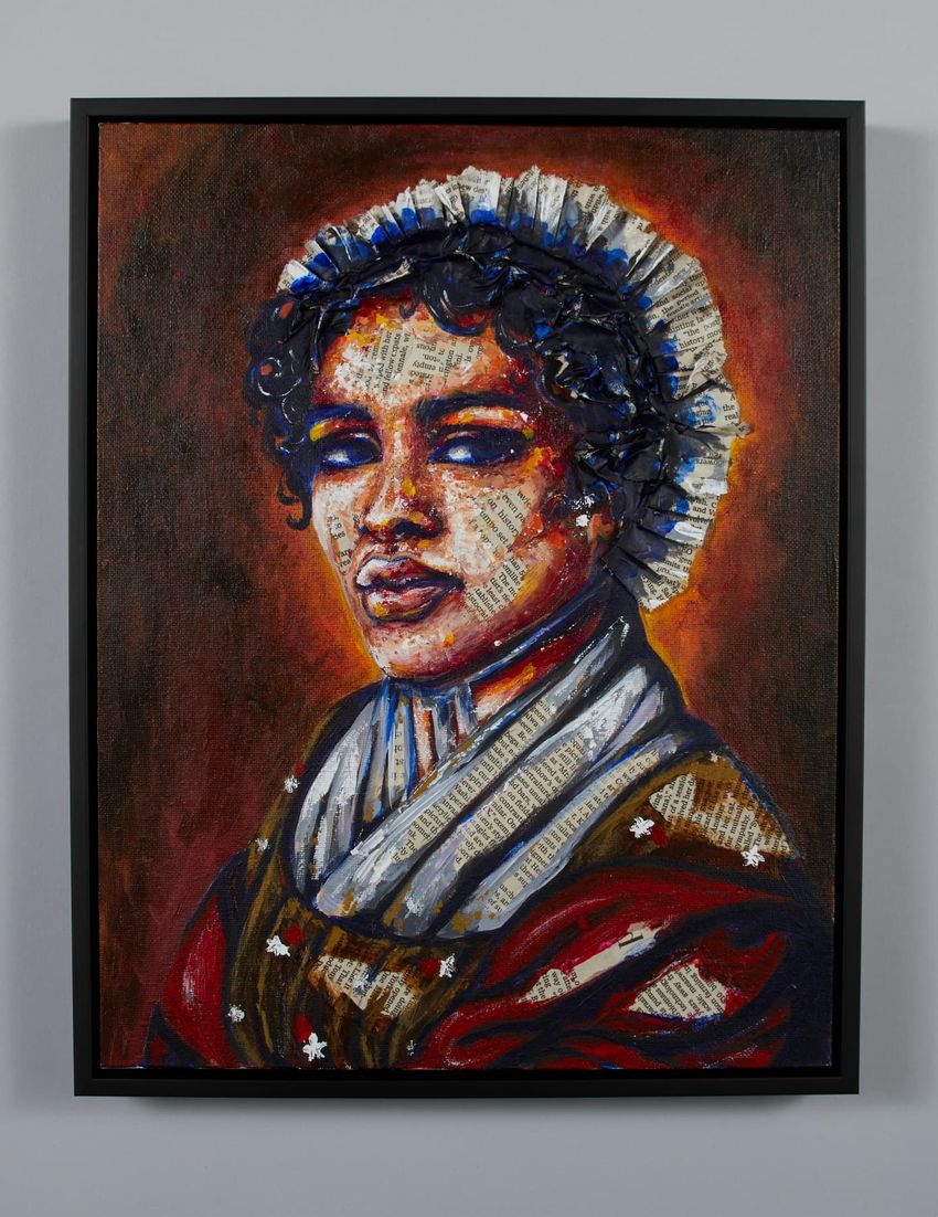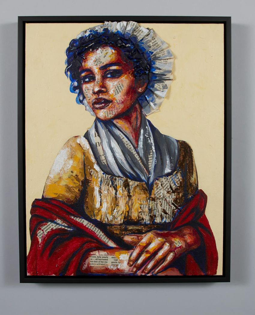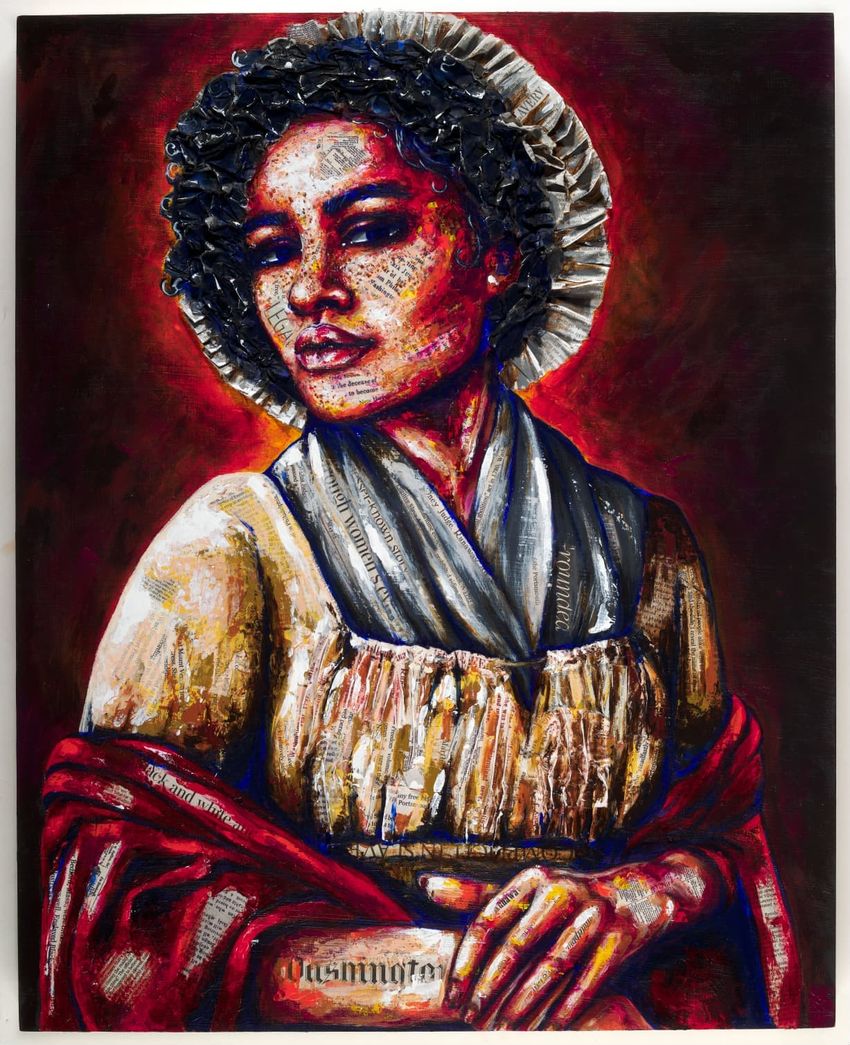 Contemporary portrait of Ona Judge, depicting a Black woman in early-nineteenth century dress. Made from acrylic paint and newspaper accounts.