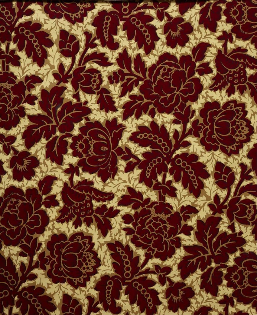Wallpaper sample, yellow and beige background with deep red floral pattern.