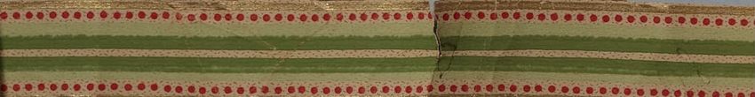 A thin wallpaper border sample with speckled tan background and horizontal lines of gold foil-like stripe, repeating red dots, light green, and medium green. Bottom half of the border is the same as above but in reverse.