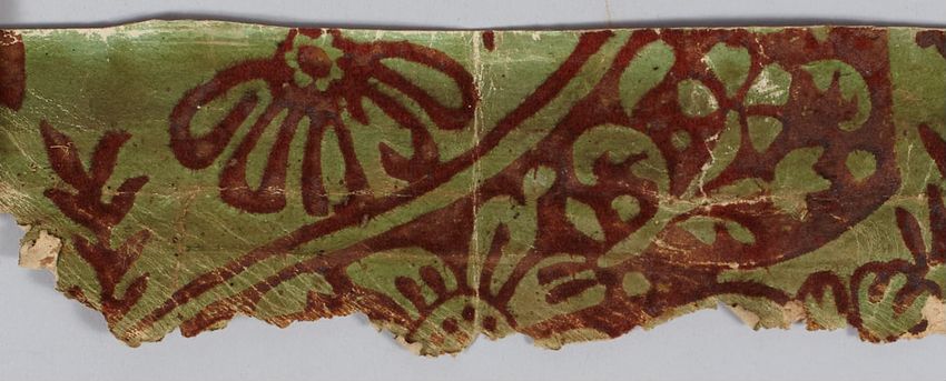 Flocked wallpaper fragment with green background and red brown floral motif from house owned by Rufus Greene and John Amory.