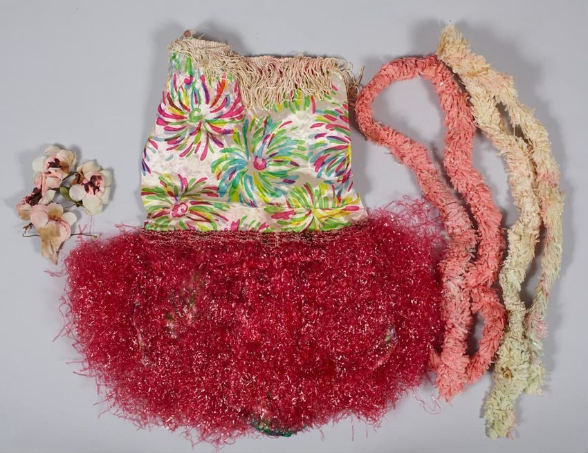 Embroidered silk satin fabric patches edged with pink lace. Likely made by Helen E. Endicott (1868-1930) of Canton, Massachusetts.