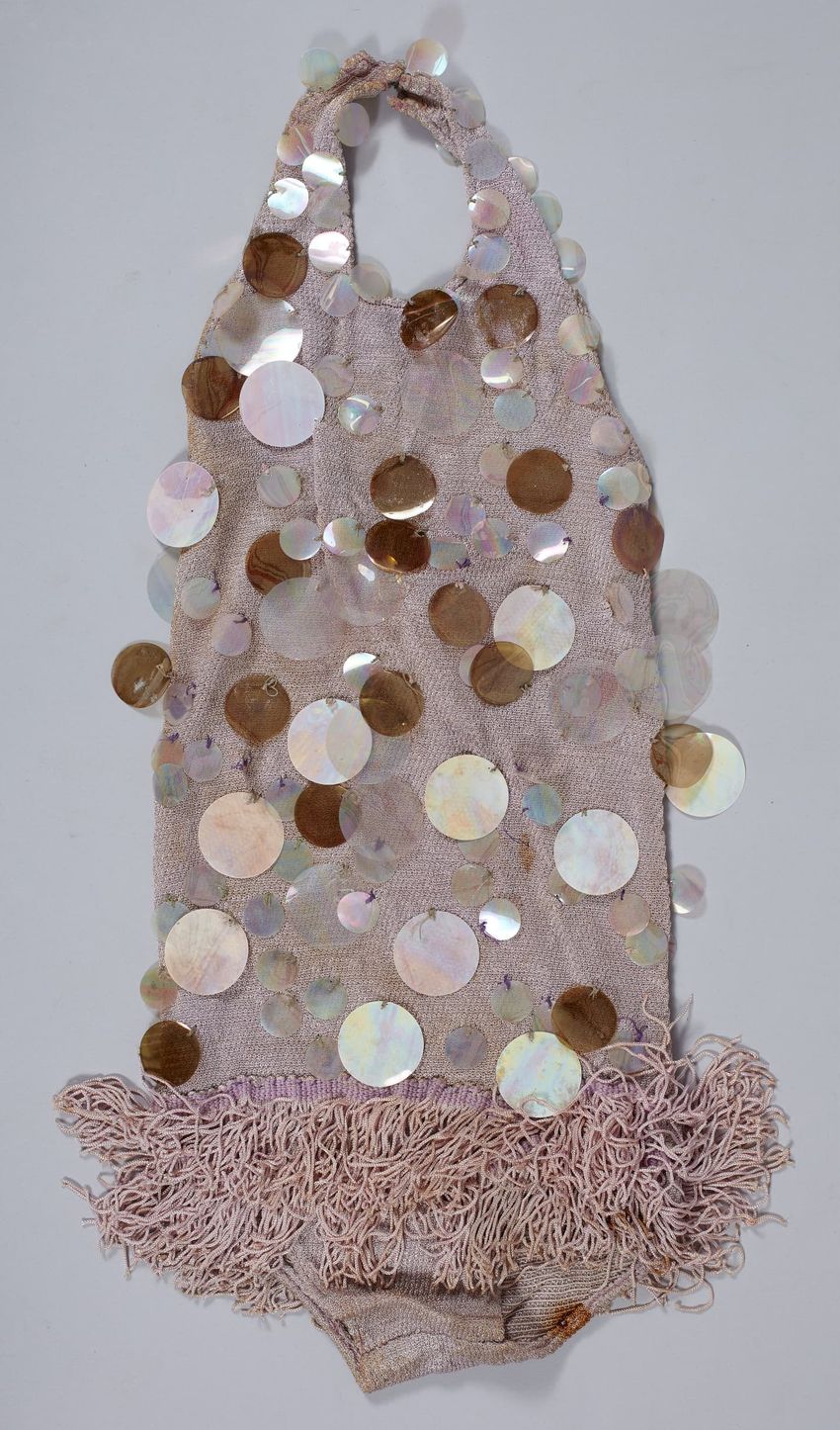 One piece lavendar knitted child's dance costume with a halter top, double row fringe on bottom hem, and adorned with many round sequins of various sizes and colors (silver, purple).