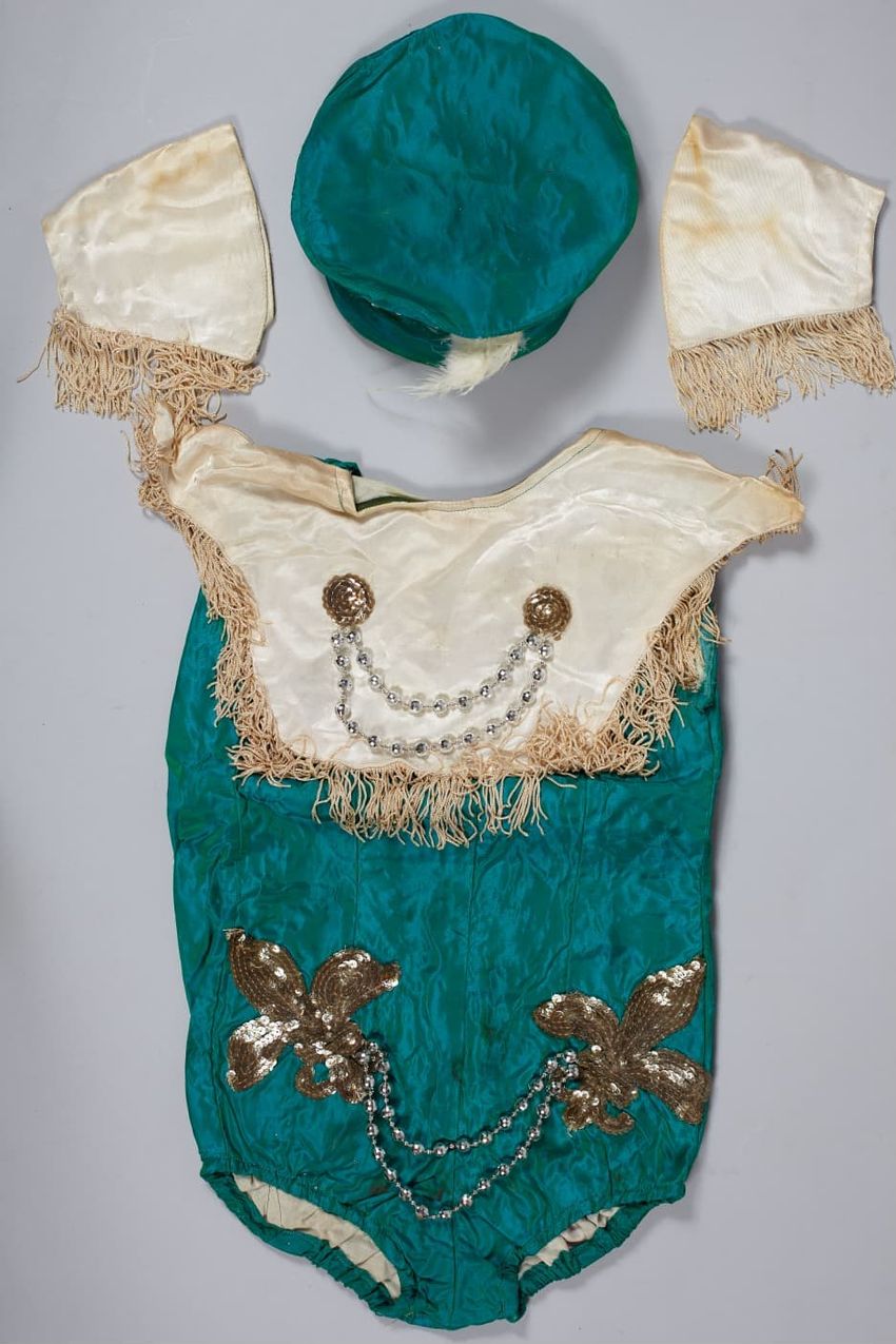 Four piece military or marching band inspired child's dance costume comprised of a blue / green changable body suit or leotard adorned silver sequin fleur-de-lis on front of hips joined with two strands of silver plastic beads and a fringed white collar with two round spirals of silver sequins joine...