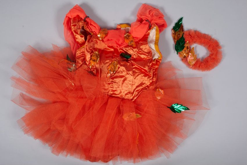 A child's dance costume comprised of two pieces. Includes a orange bodysuit or leotard with attached orange tulle tutu--both adorned with die-cut, multicolor, foil leaves. Also with orange tulle and foil leaf headband.