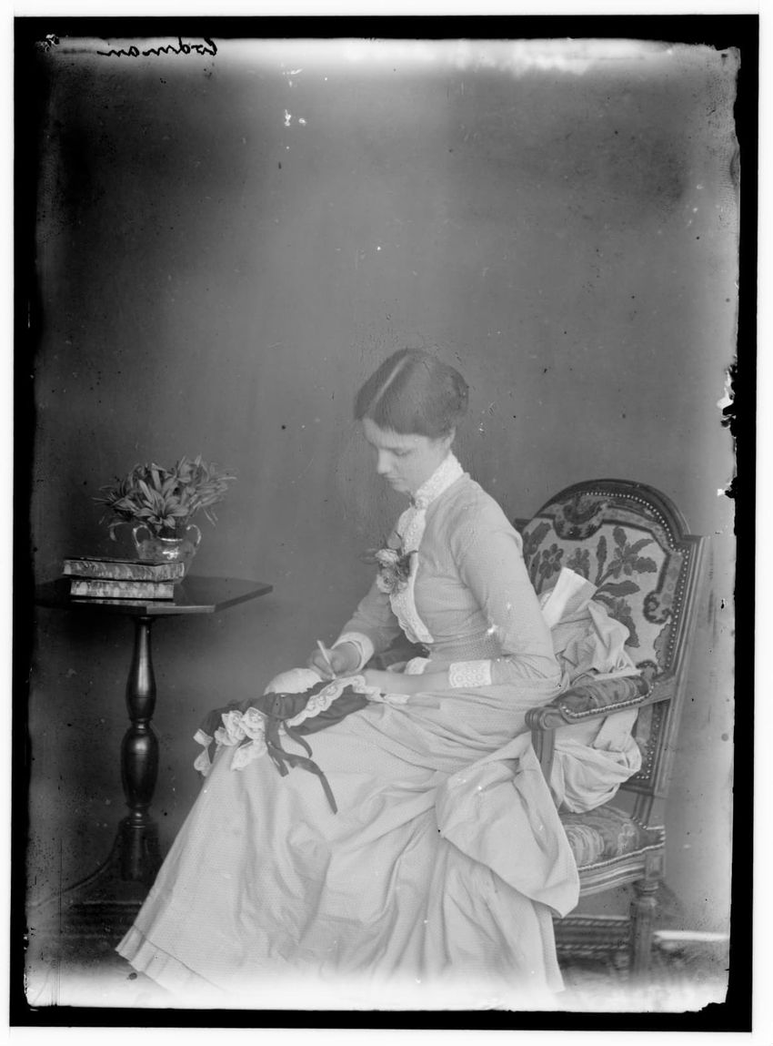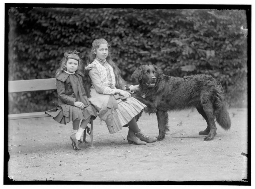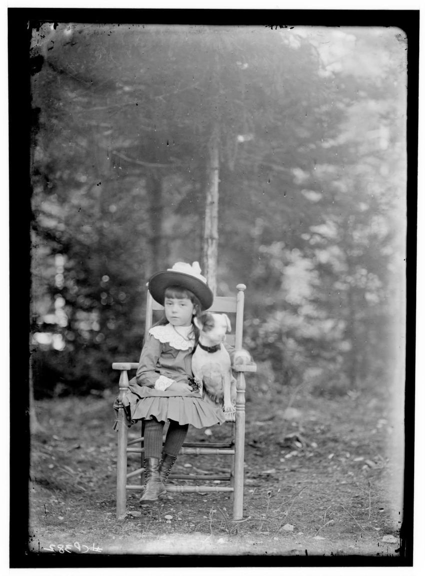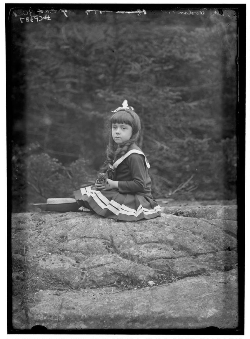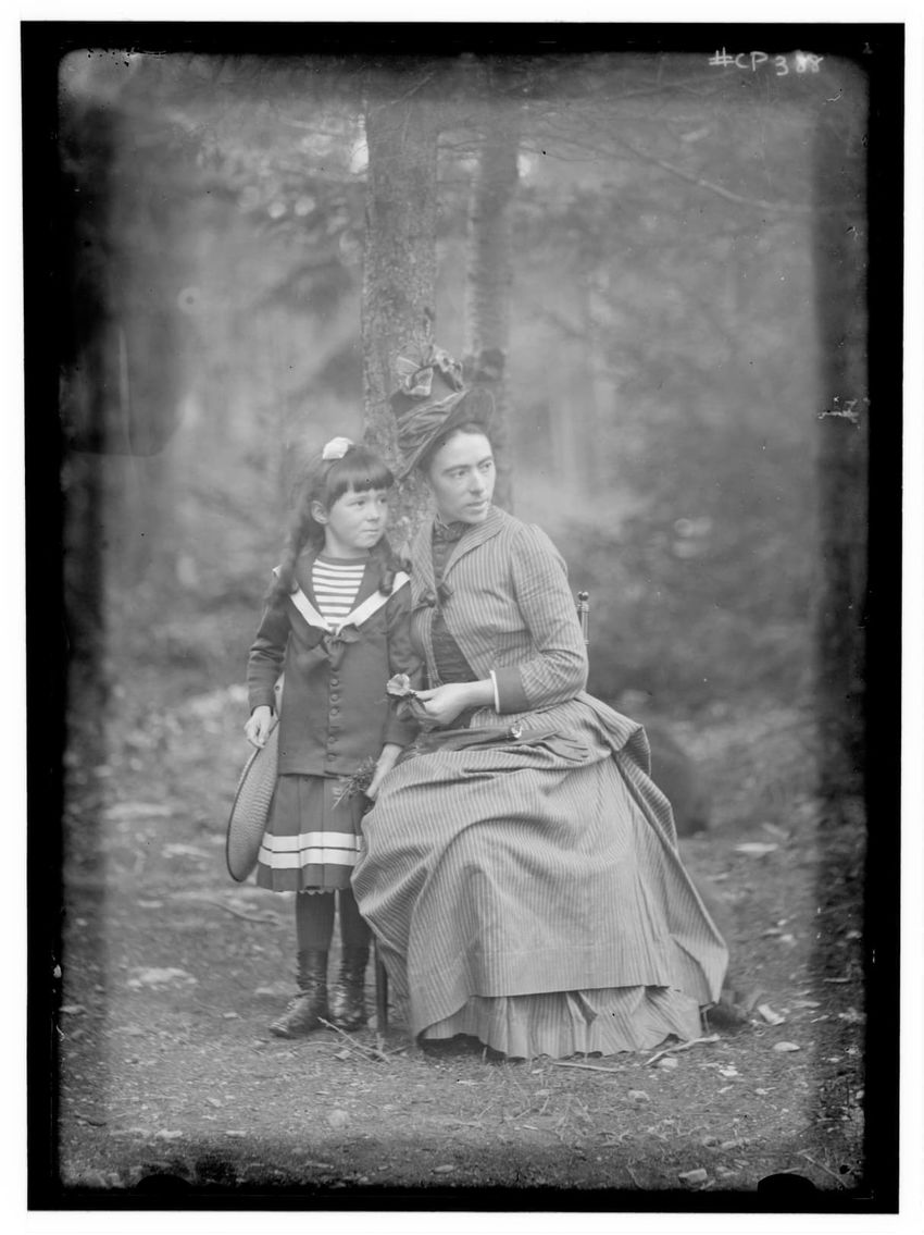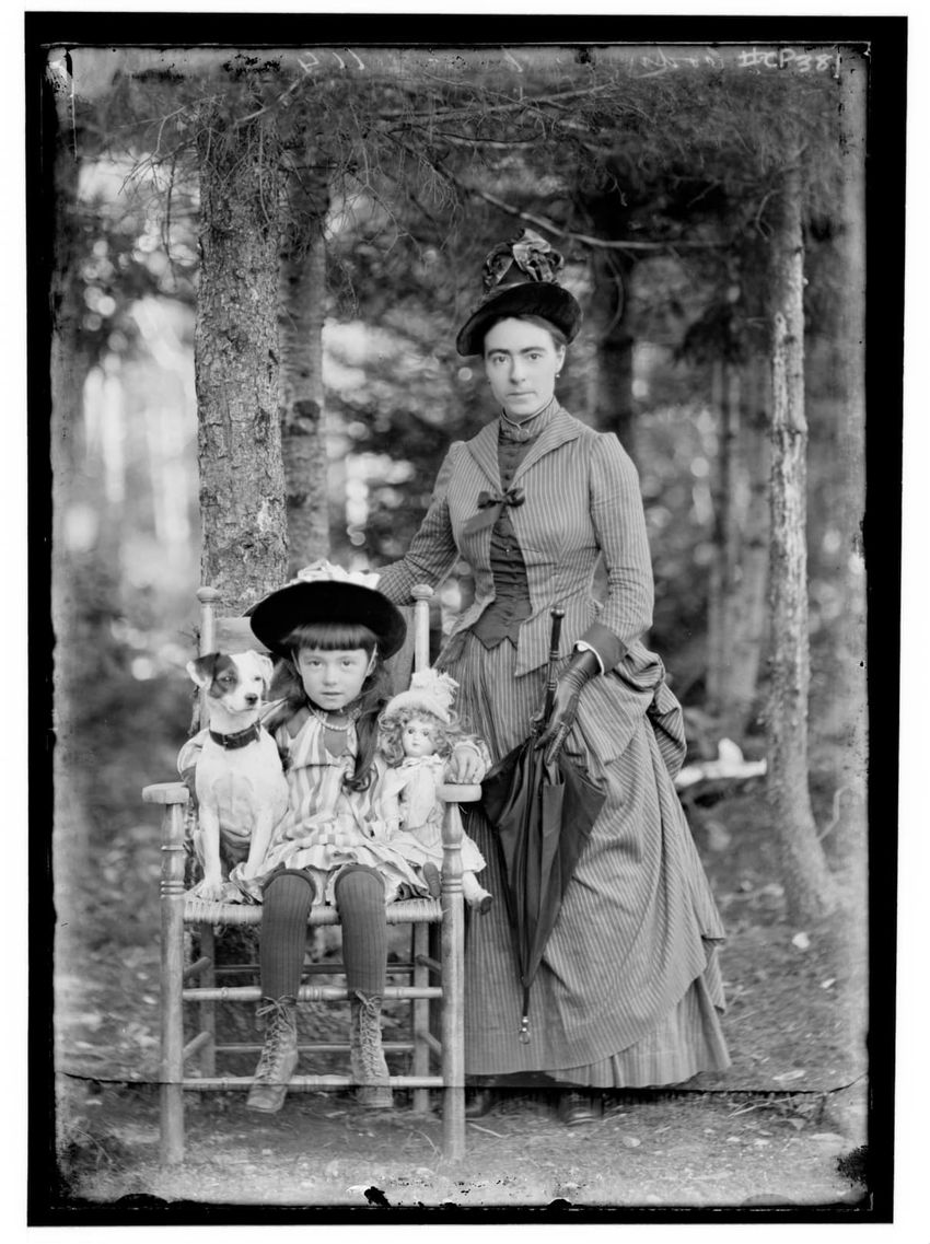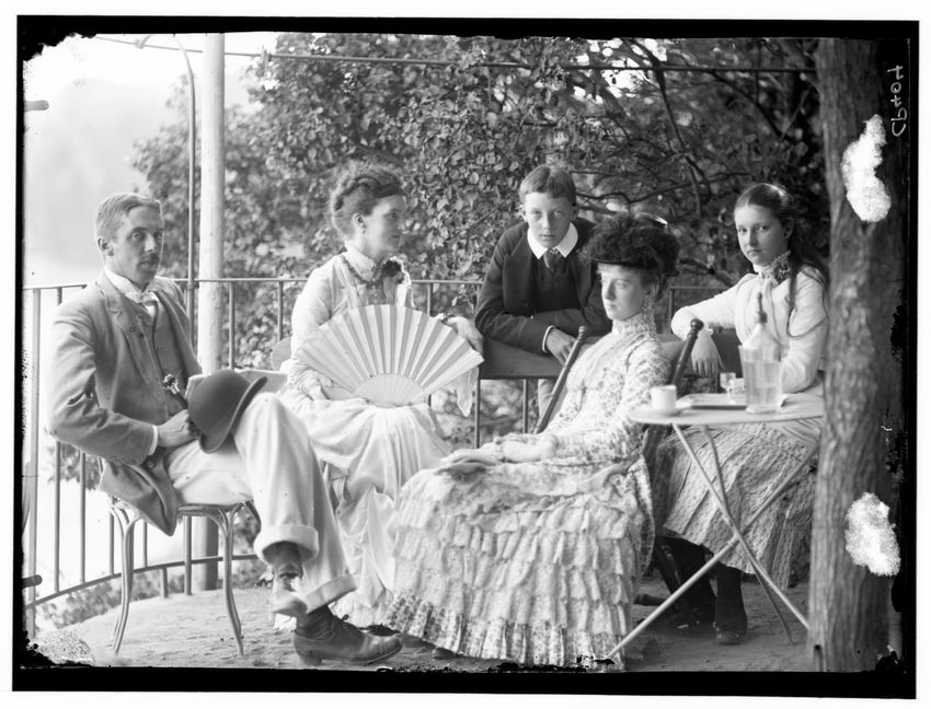 The image is a group portrait featuring two women, a man, and a young girl seated together. The man and women are dressed in dark clothing, and the women are wearing head coverings. The girl, seated in front, wears a dress with striped accents.