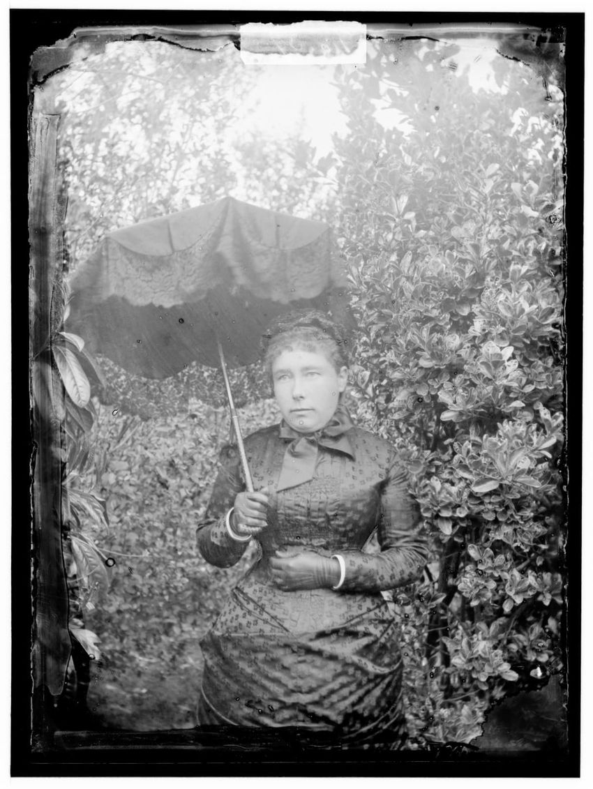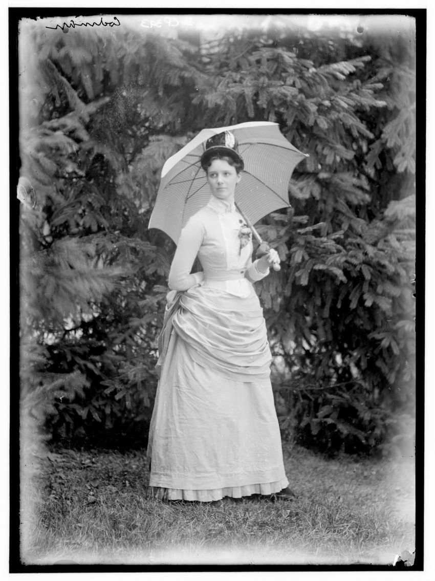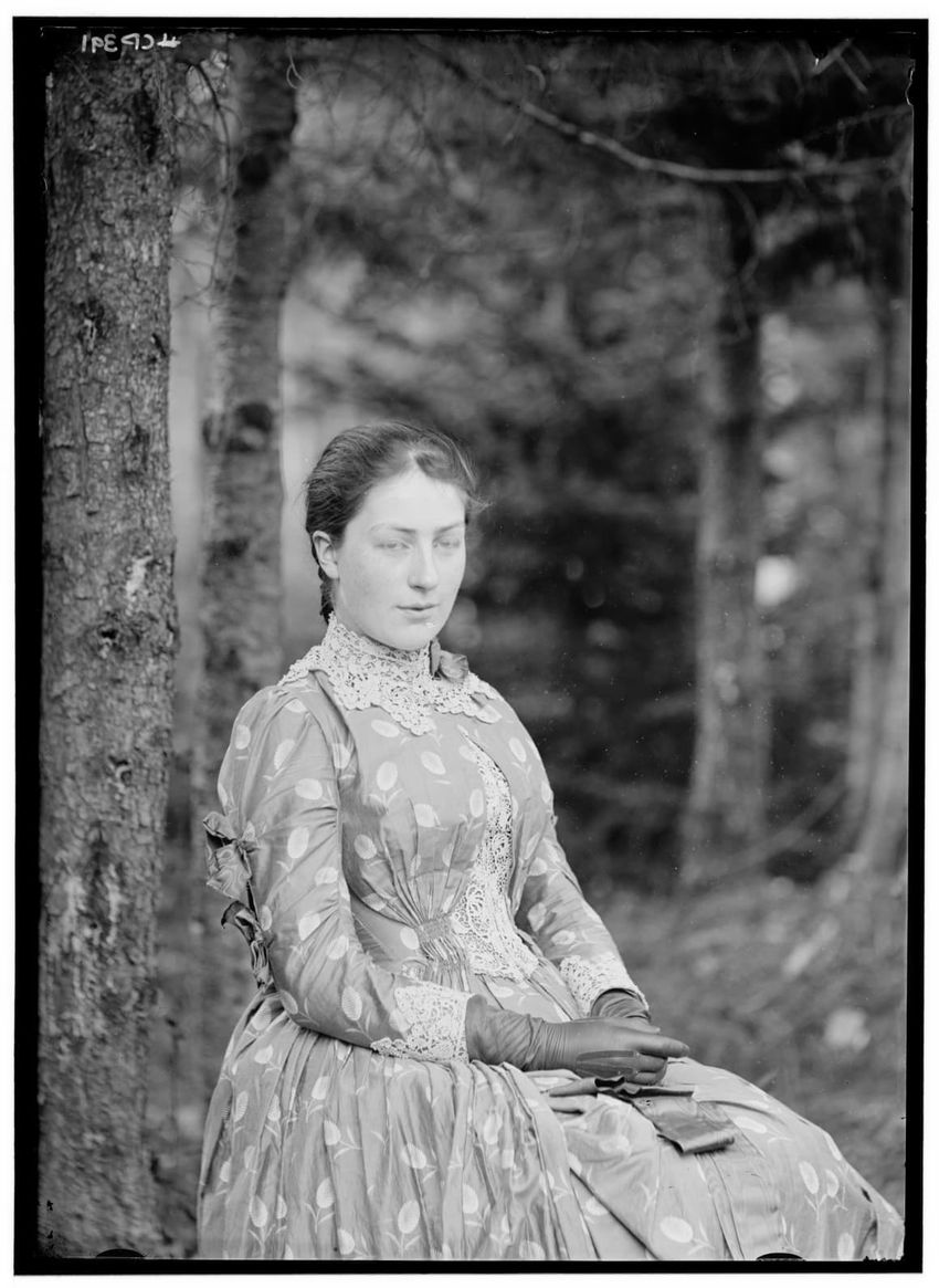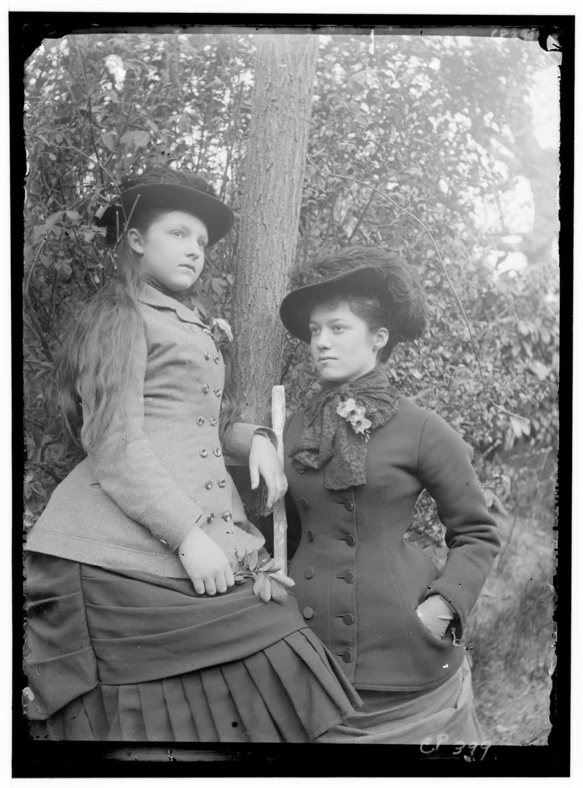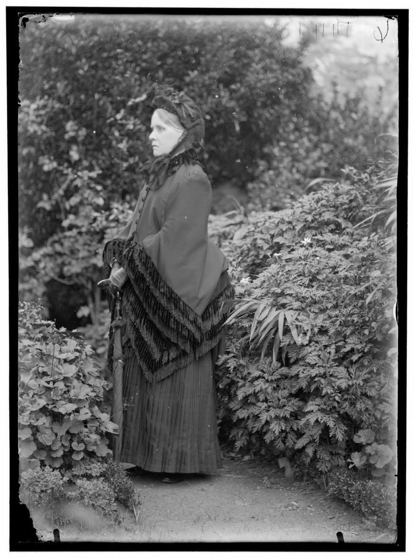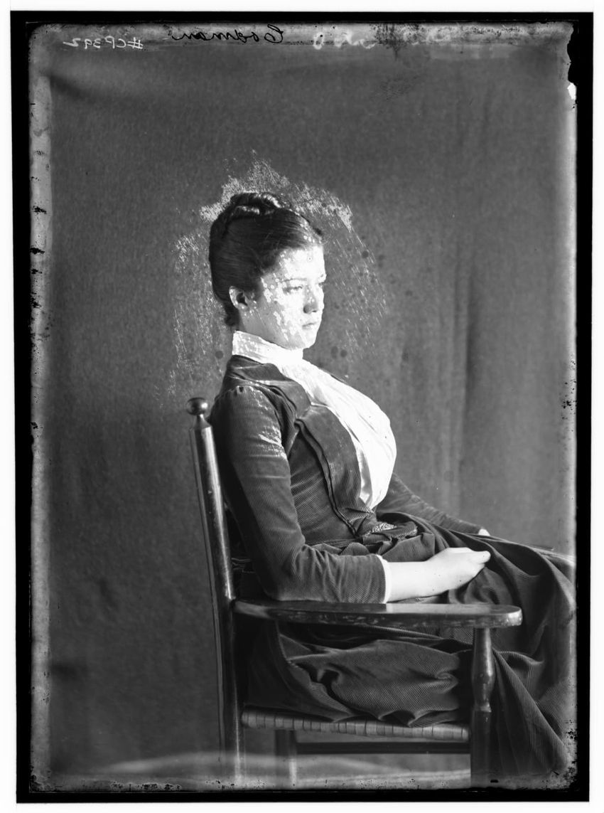 The image is a group portrait featuring two women, a man, and a young girl seated together. The man and women are dressed in dark clothing, and the women are wearing head coverings. The girl, seated in front, wears a dress with striped accents.