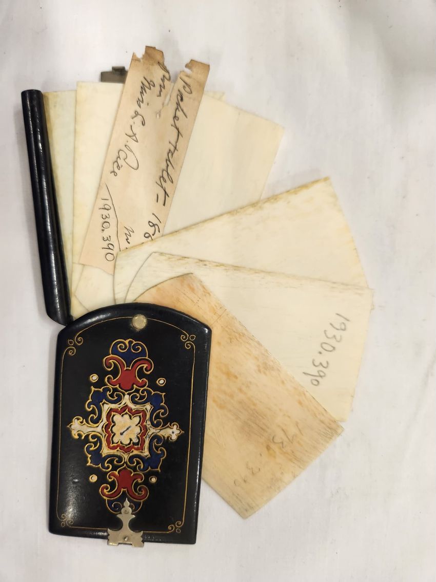 Small rectangular paper box and detached lid with glass panel. Painted color scene of red-roofed, stone building, trees and moat. Sides of box are vaulted and covered in paper. Box and lid are trimmed with gilt, embossed paper strips. Interior lined with bright yellow paper.
