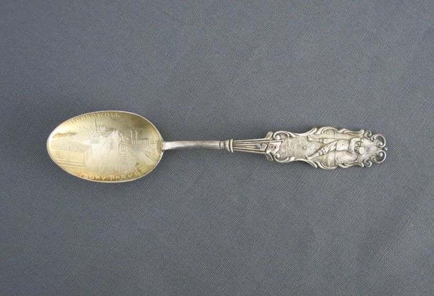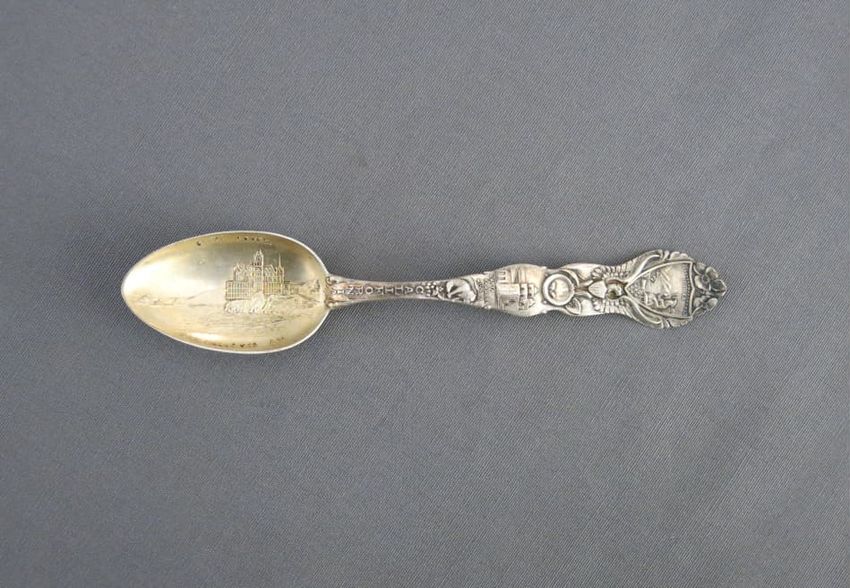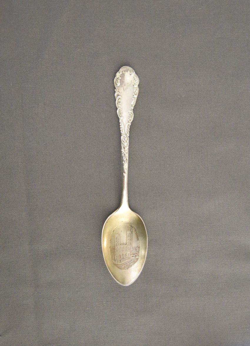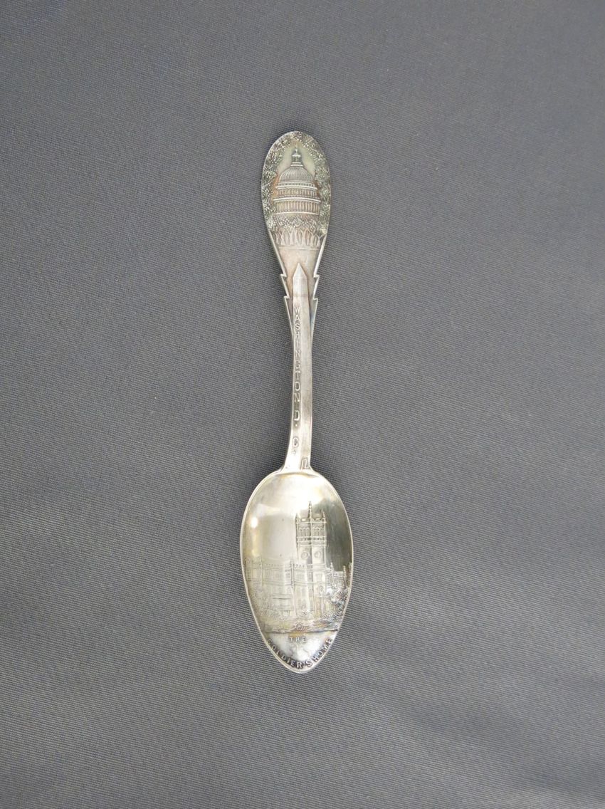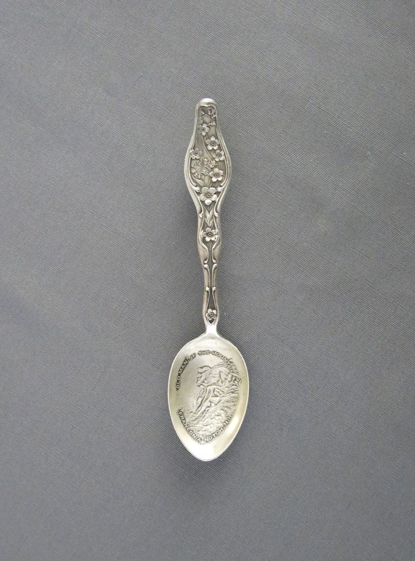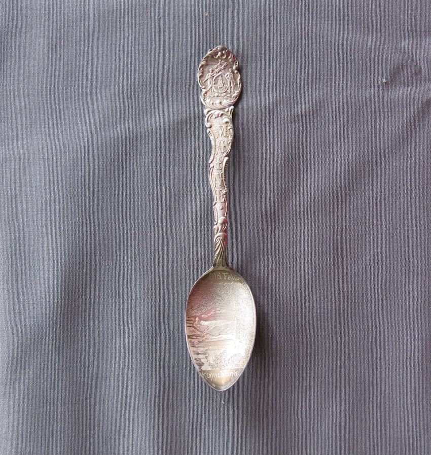 Souvenir spoon, molded sterling silver with image of the Portland Head Light on spoon bowl. Handle depicts pine cones, an observatory tower, and Longfellow's home. Finial depicts the face of a bearded man, a scroll, and a book. A tall pine tree, "Court House", and "Portland Headlight" are depicted o...
