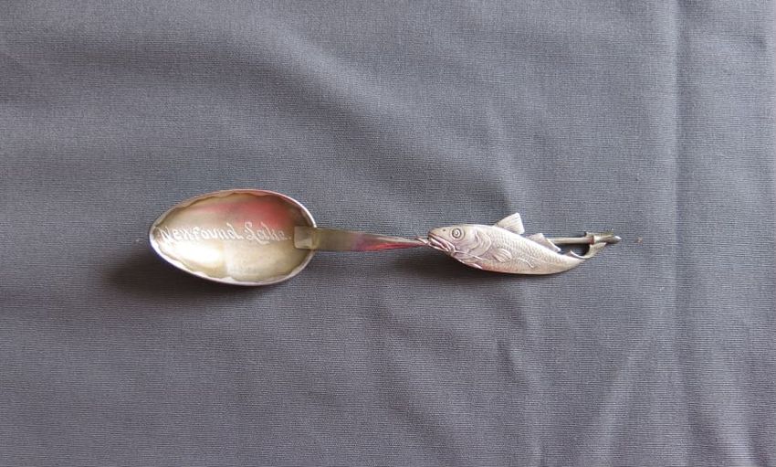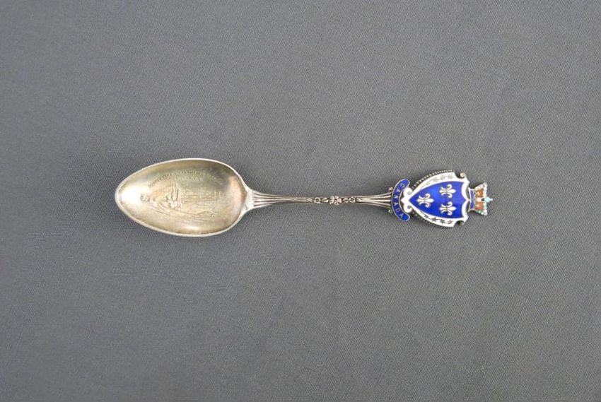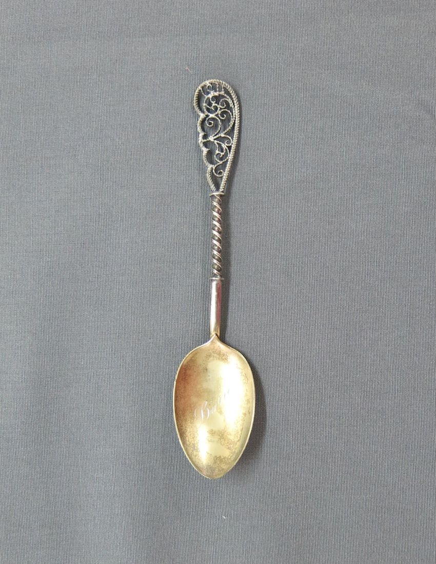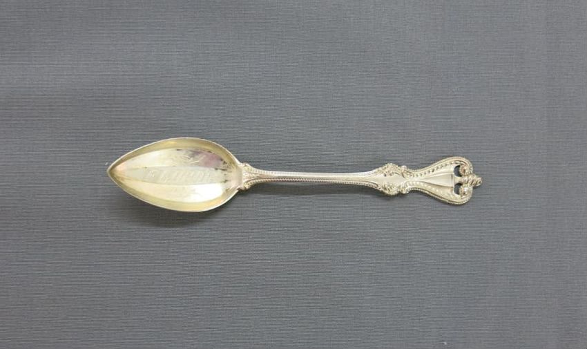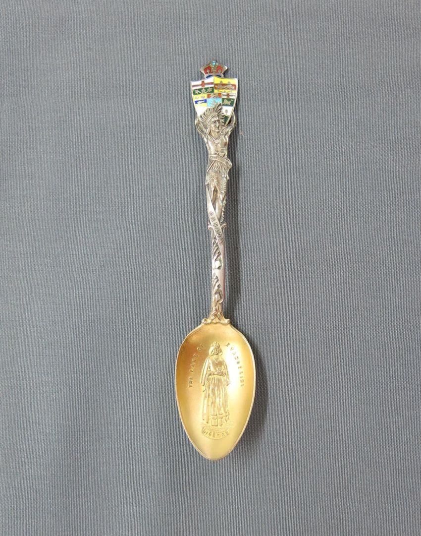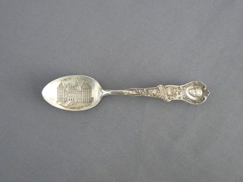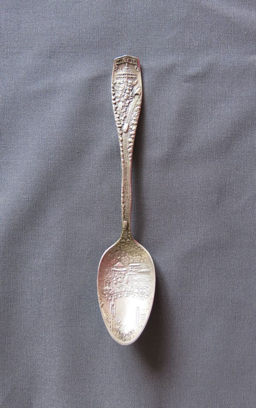 Souvenir spoon, molded sterling silver with image of the Portland Head Light on spoon bowl. Handle depicts pine cones, an observatory tower, and Longfellow's home. Finial depicts the face of a bearded man, a scroll, and a book. A tall pine tree, "Court House", and "Portland Headlight" are depicted o...