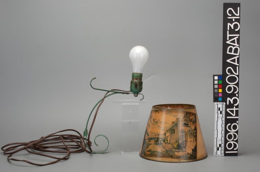 Wall lamp made of iron and painted green [A] with shade containing a seaside scene [B].